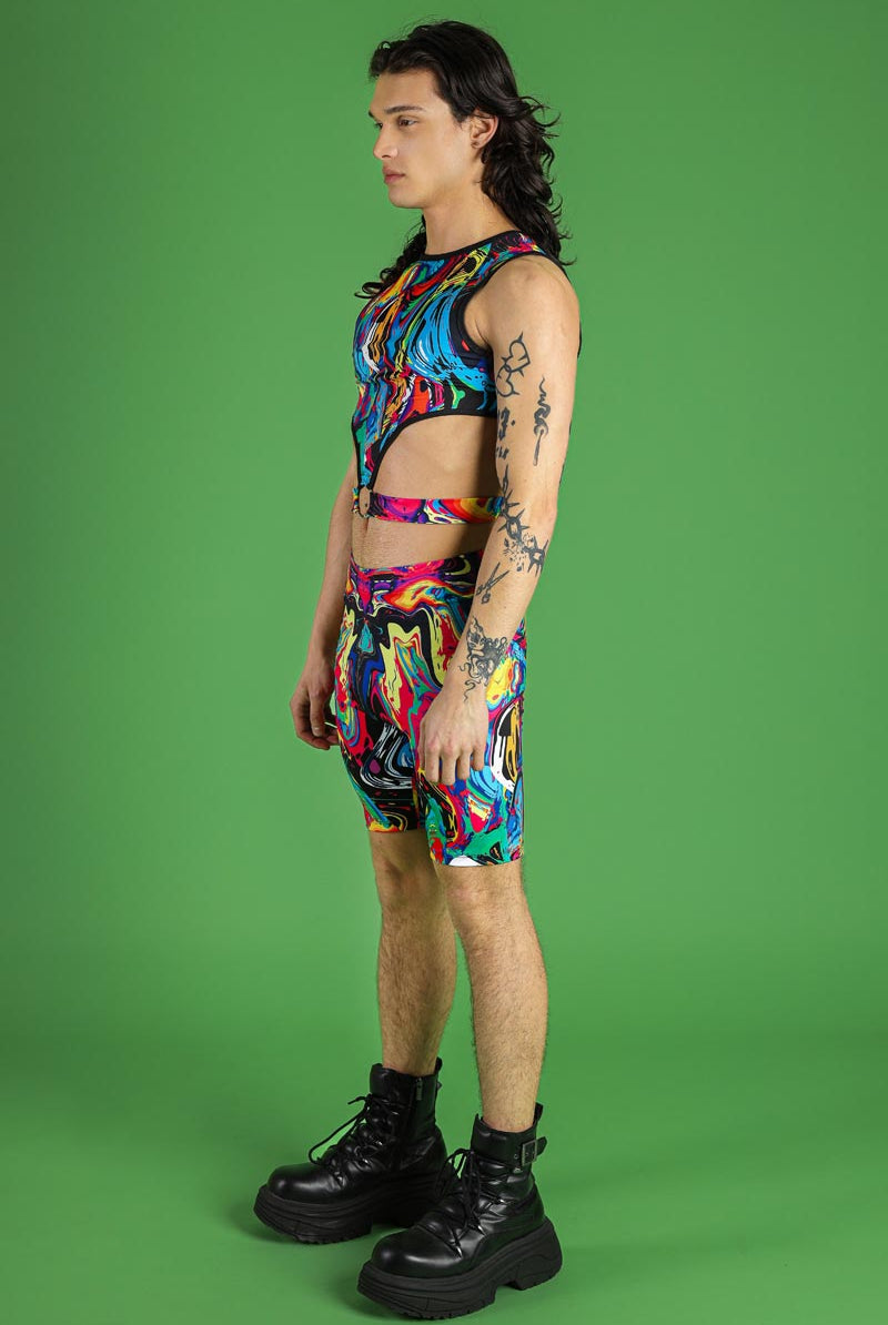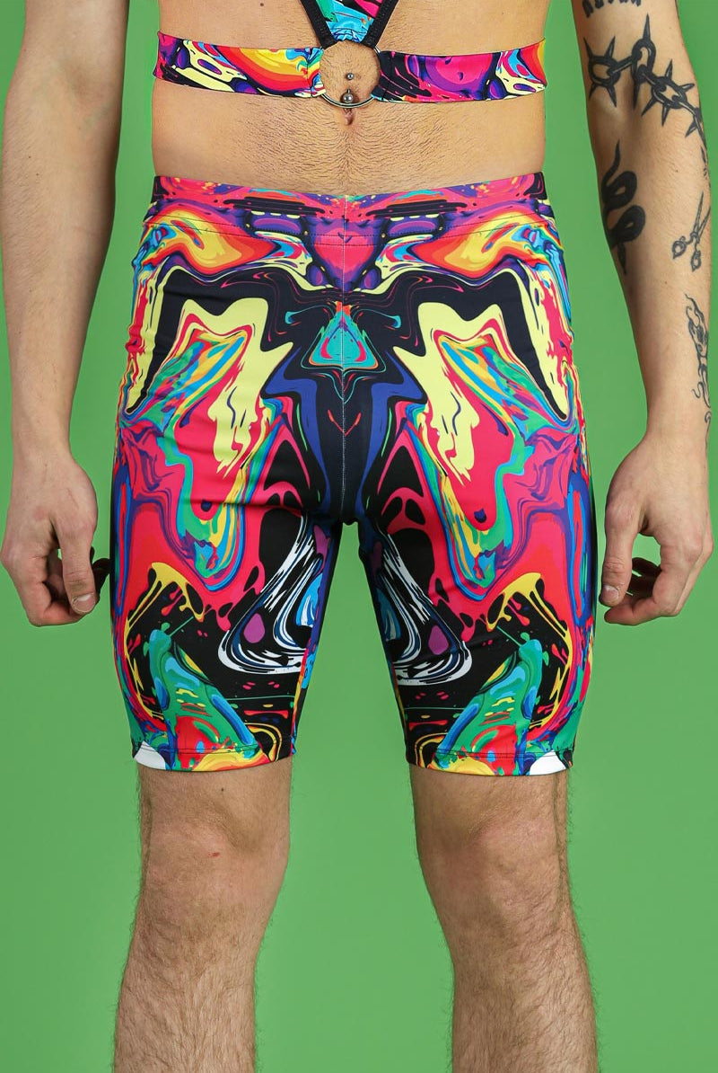 Complete your festival ensemble with these eye-catching men's biker shorts in the Inksplosion pattern. These shorts are designed for both style and comfort, featuring a high-waisted fit and elastic waistband for a secure and flattering fit. The print is a vibrant and abstract mix of colors, ensuring you'll stand out in any crowd. Whether you're dancing the night away or making a bold fashion statement, these biker shorts are perfect for pride, raves, and other festive events.