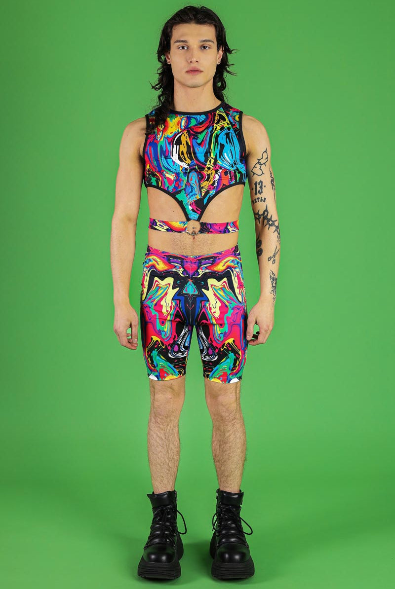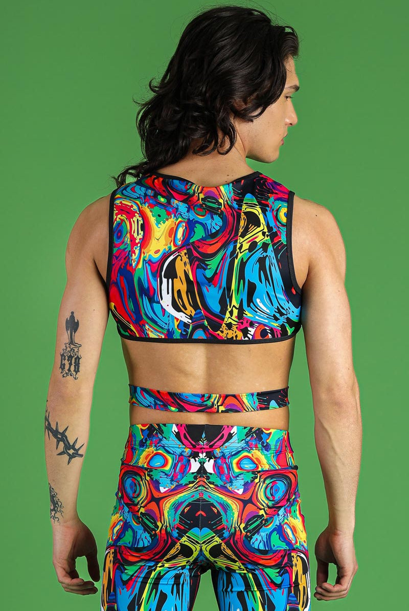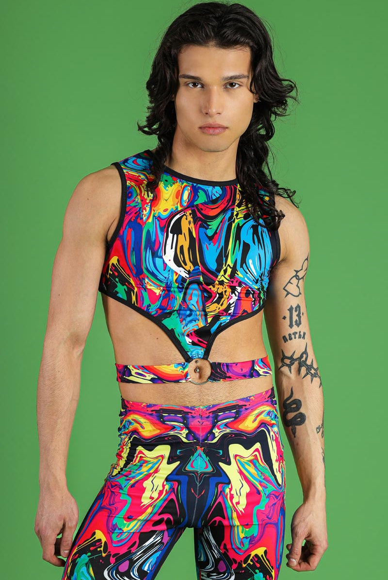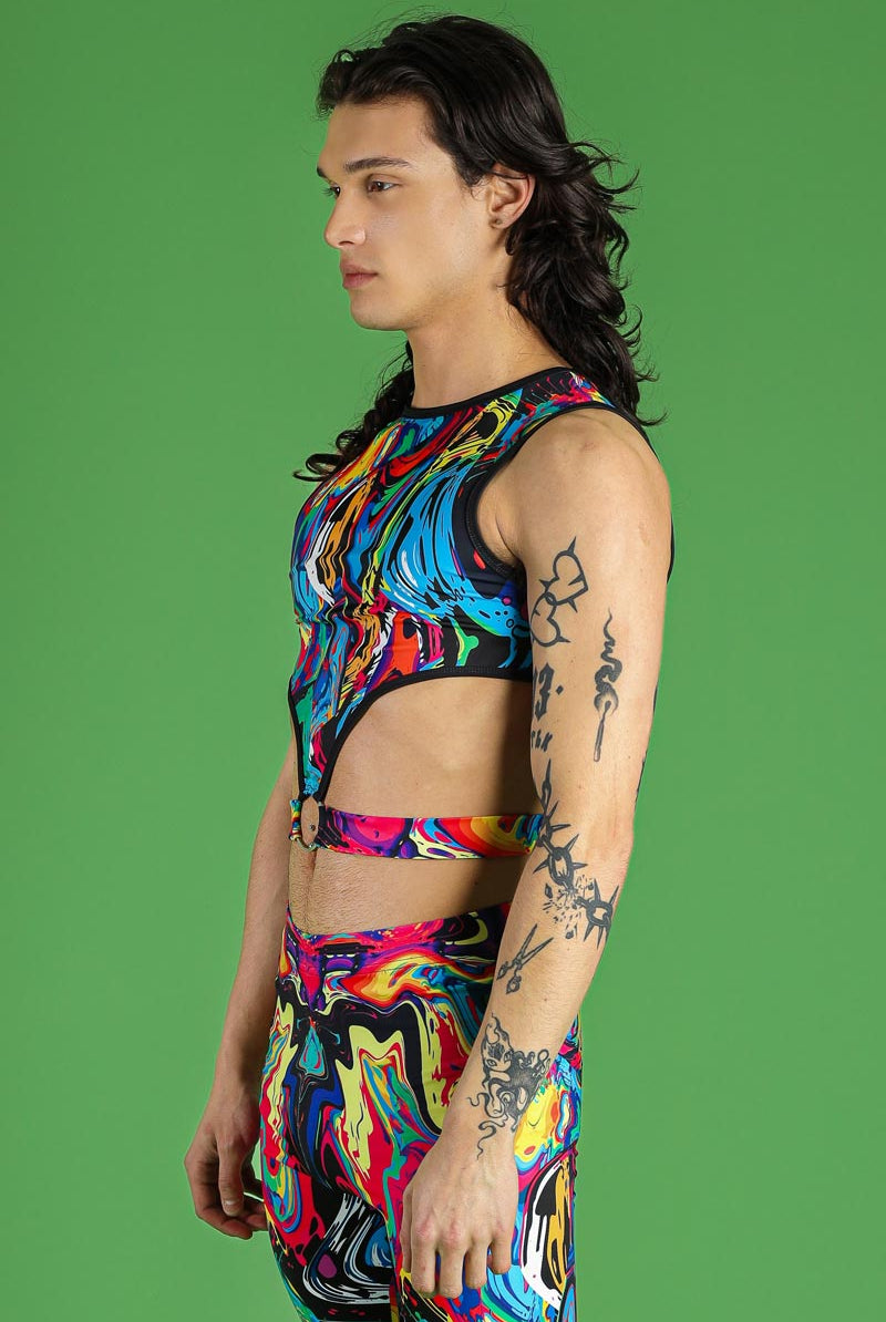 Elevate your festival look with this vibrant men's O-ring cut-out tank top, showcasing the dynamic Inksplosion pattern. This top features a unique cut-out design with an O-ring accent, adding an edgy twist to the classic tank style. The neckline is a standard round neck, providing comfort and versatility. The Inksplosion pattern is a mesmerizing blend of swirling colors and abstract designs, making it perfect for pride, rave, or other festive events. Embrace boldness and creativity with this standout piece from our pride collection.