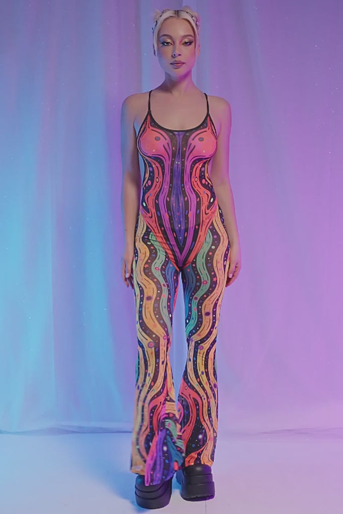 This mesh open back jumpsuit turns the volume all the way up with a swirl of neon waves, curve-hugging seams, and flared legs built for stomping the dance floor. The stretchy, breathable fabric moves with you, making it a rave clothing must-have for bold babes who own their spotlight.