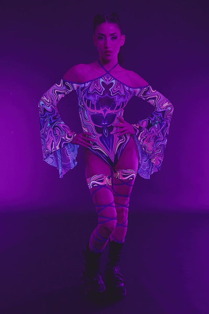 Summon your dark side in this V-neck strap bodysuit with garters, dripping in devilish purples, fiery reds, and molten pink swirls. The fierce silhouette hugs every curve while casting hypnotizing energy with every move. This isn’t just a rave outfit—it’s your wicked transformation in full power mode.