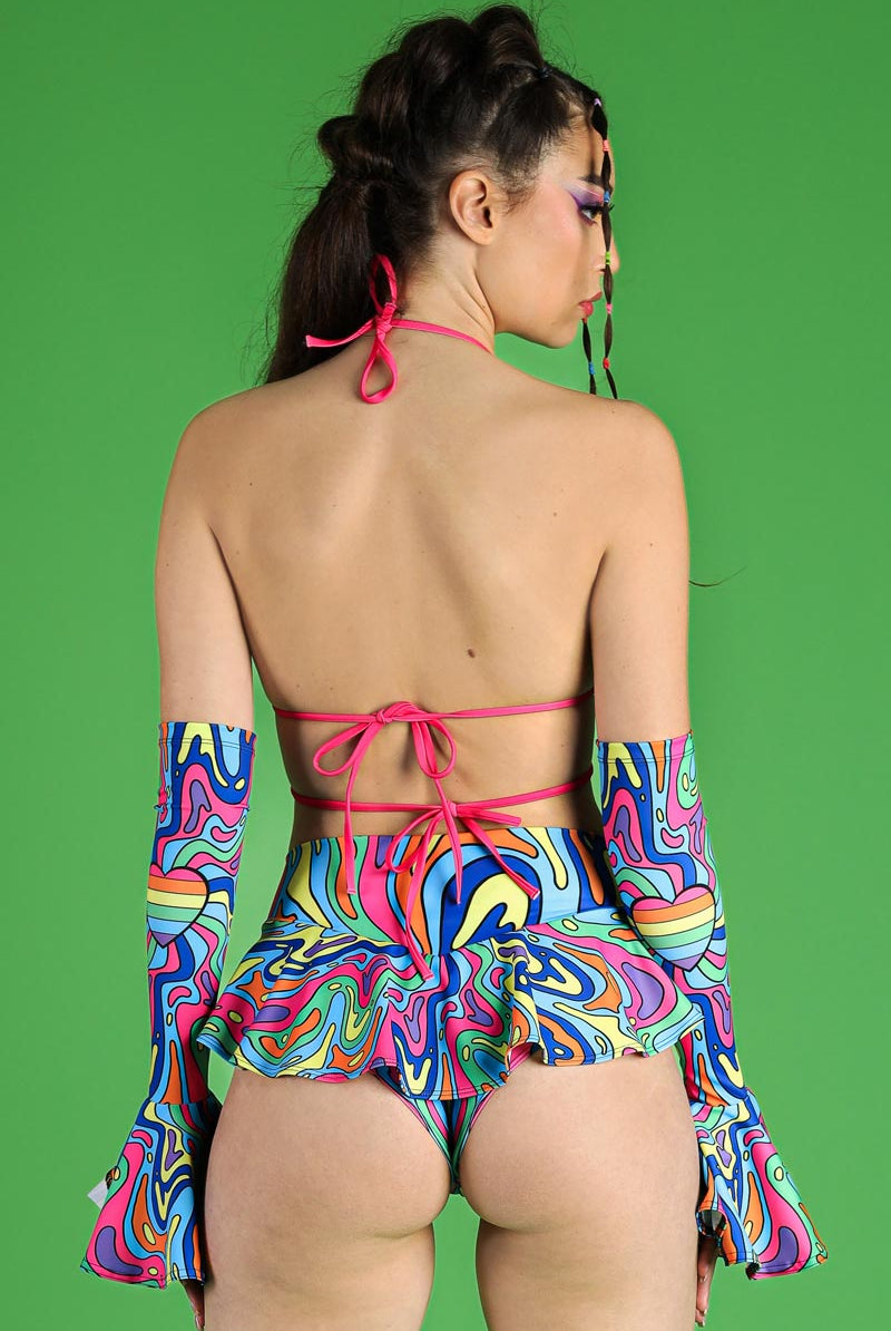 Flaunt a flirty and fabulous look with these ruffled shorts with doodles design. The shorts are designed with playful ruffles that add volume and a touch of whimsy, while the psychedelic pattern in rich, lively colors dances across the fabric. These bottoms are ideal for adding a pop of personality and color to your summer outings or festive occasions.