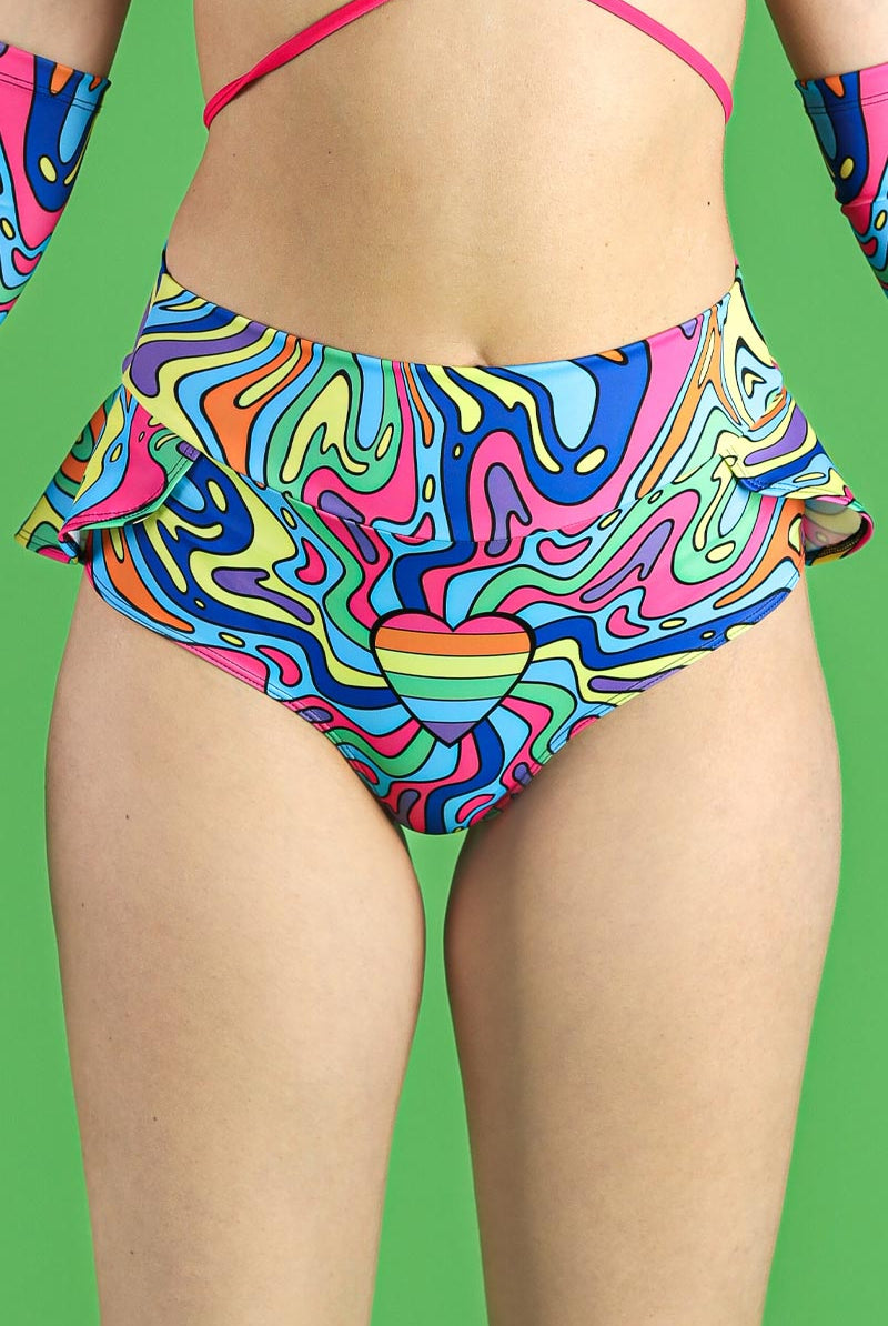 Embrace the full spectrum of fun and flair with the doodles set, combining our strappy heart-ring bikini top and booty shorts. This ensemble is unified by a dynamic, colorful doodle pattern that flows beautifully from top to bottom. Finished with unique sleeves that match the set's vibrant aesthetic, this outfit is tailor-made for those who cherish bold patterns and playful designs in their fashion choices.