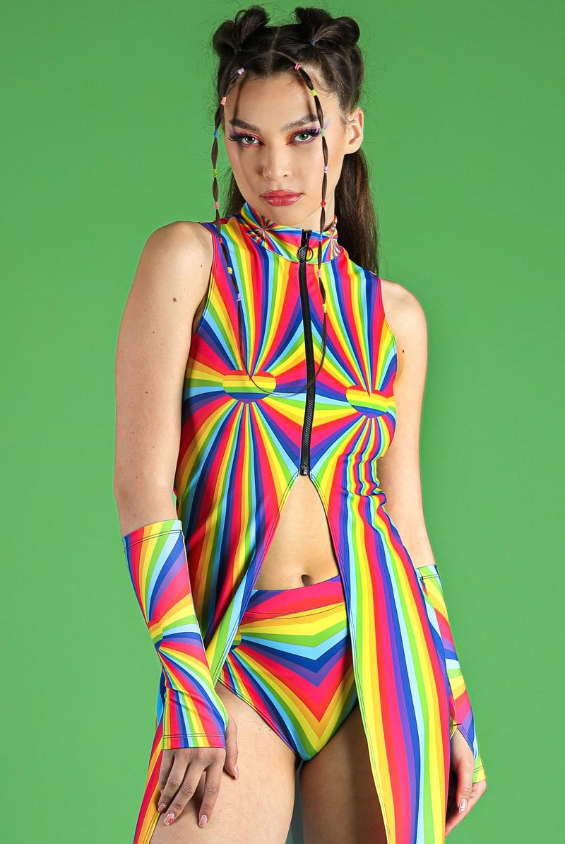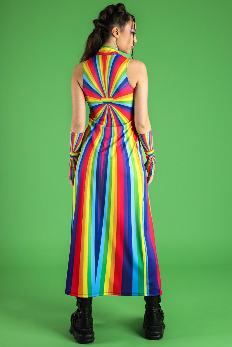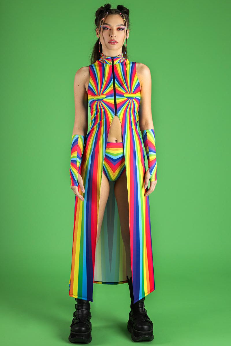 This maxi dress from our pride collection combines striking visual appeal with thoughtful design. Named the Love is Love pattern, this sleeveless dress captivates with a kaleidoscope of vibrant stripes that demand attention. It features a unique front zipper, which allows for adjustable comfort and style. Cut-out details provide an edgy flair, complementing the flowing silhouette that extends into a dramatic floor-length hem. Completing the look are matching sleeves that enhance the dress’s dynamic design, making it an ideal choice for any pride or rave festival where you want to make a bold statement.