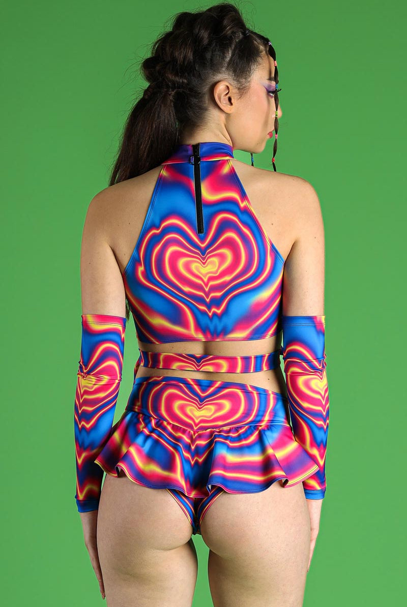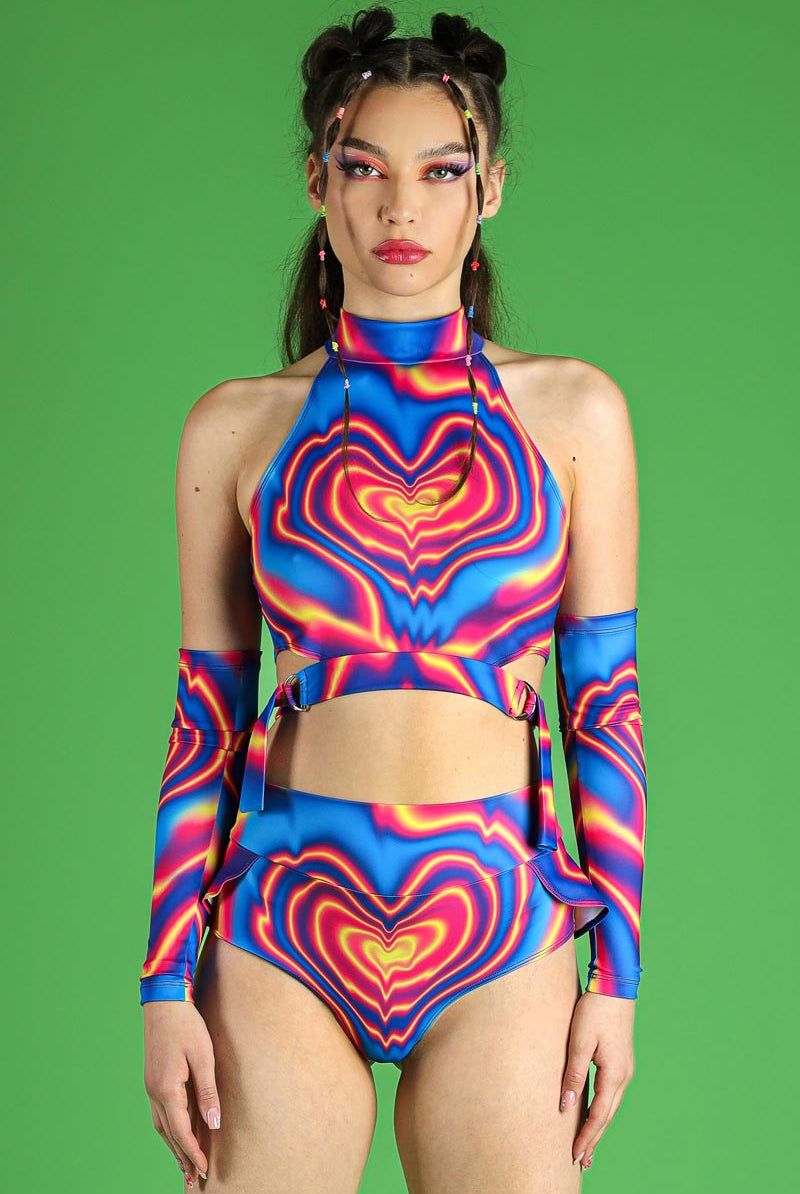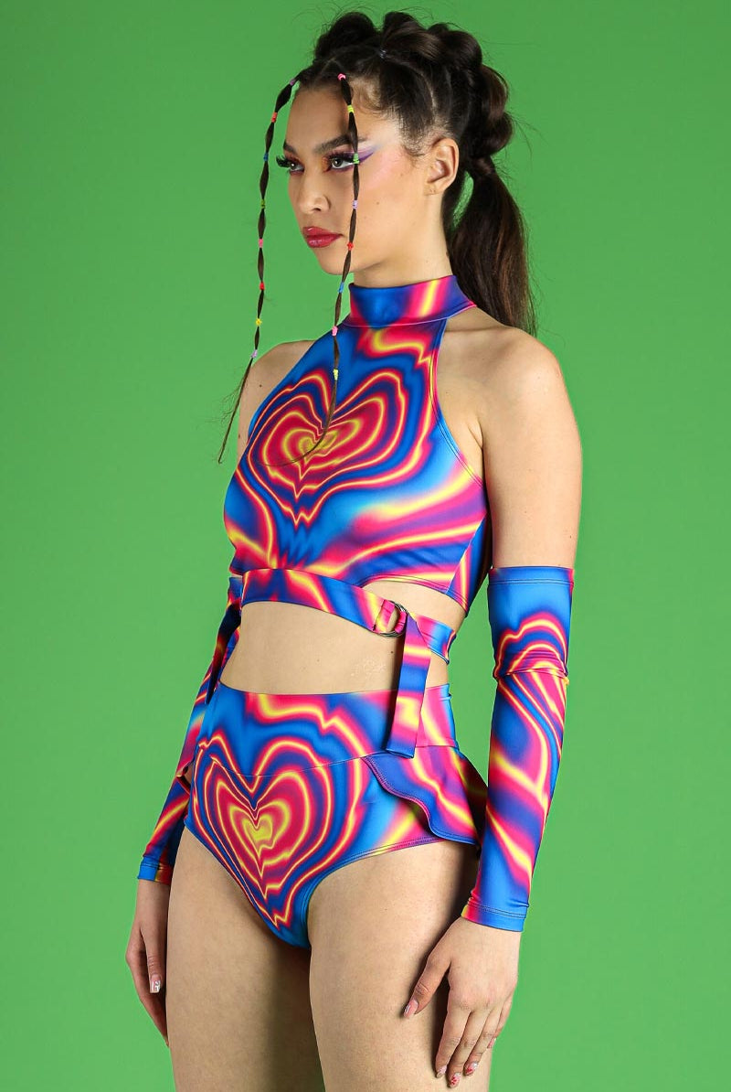 Step out in style with this high-neck crop top from our Pride collection. Dressed in the eye-catching Love Voltage pattern, this top features a back zipper for a secure fit and is accentuated with a unique belt that threads through sleek metal rings, highlighting the waistline. The vibrant print and contemporary design make it perfect for any pride or rave event, blending standout style with practical functionality.