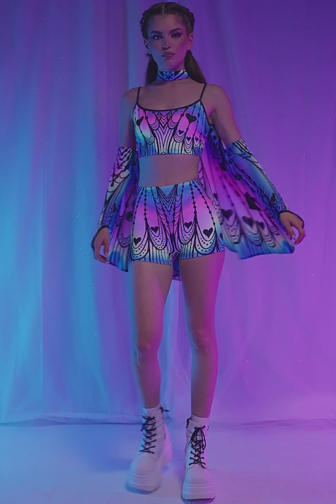 These high-waisted shorts are pure pastel power—featuring a hypnotic butterfly-wing print, smooth stretch fabric, and a curve-hugging fit that pops on the dance floor. They're breathable, flexible, and made to move with you. Let your vibe speak volumes in this fearless piece of festival wear.