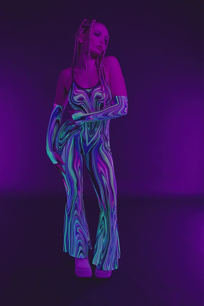 Step into a kaleidoscopic dream with this open-back jumpsuit and matching arm warmers—drenched in hypnotic swirls of mint, lemon, sky blue, and hot pink. The curve-hugging fit and flared legs turn your rave outfit into pure liquid motion. U don’t dance through the night—u dominate it.