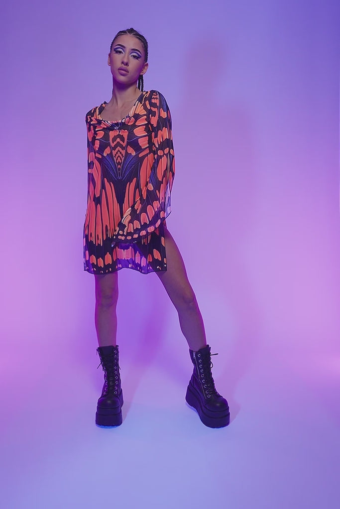 This mesh slit mini dress is Monarch-core with a dark twist. Featuring fiery orange butterfly pattern and dramatic side slits, it’s the perfect fusion of ethereal and badass. Lightweight, breathable, and born for the rave—throw it on and dominate the festival flutter.