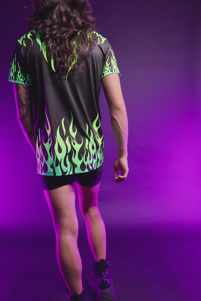 Ignite your look with the Neon Fire Dance male tee! This UV-reactive tee pops with neon green flames that blaze against the black fabric, turning heads with every move. Designed for Halloween nights and rave vibes, it’s all about making u stand out. Want to own the spotlight? Cuz this shirt's got u covered!