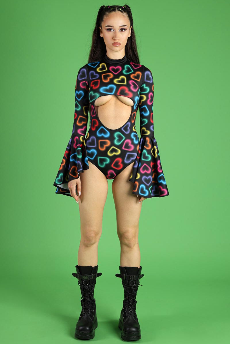 Neon Hearts Bell Sleeve Cut Out Bodysuit