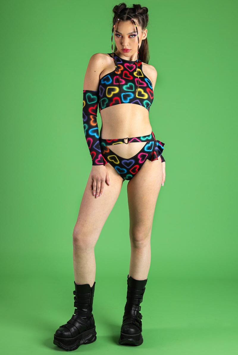 Make a statement with this vibrant crop top featuring the Neon Hearts pattern. This top is designed for maximum impact with its eye-catching array of neon-colored hearts, ideal for any pride or rave festival. The top’s construction includes a sleek, pull-on design, which ensures ease of wear without compromising on style. It’s perfect for those who value both comfort and standout fashion.