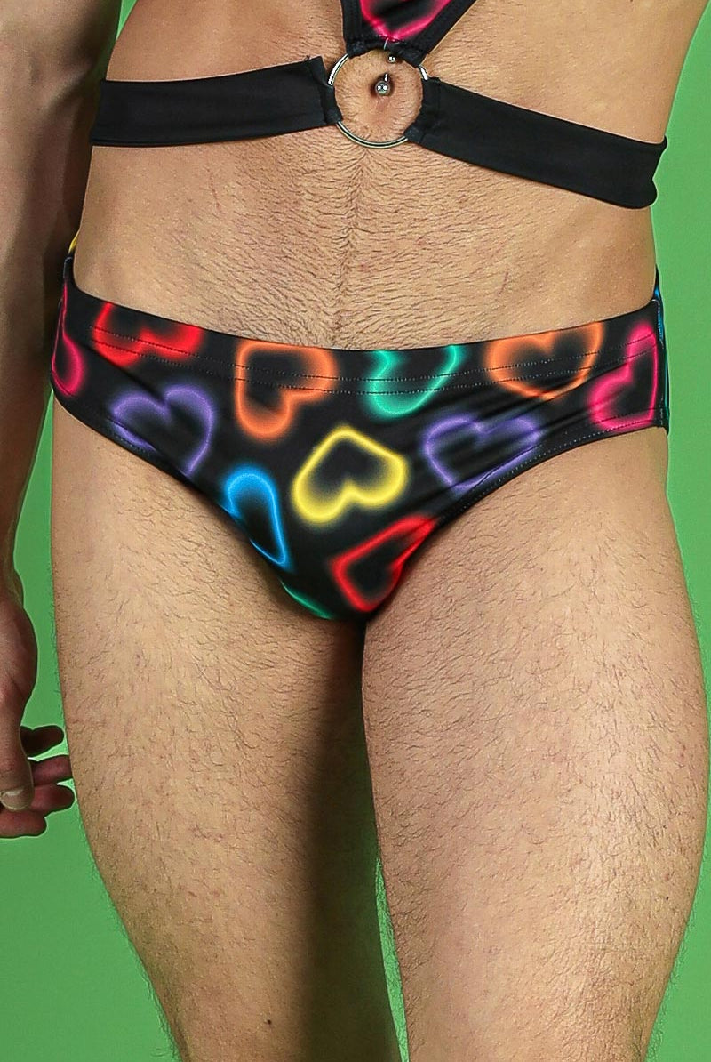 Step into comfort and style with our men's low-rise snug briefs. These briefs offer a sleek fit that hugs your body, providing both support and freedom of movement. The Neon Hearts print features a lively array of multicolored hearts on a dark backdrop, making these briefs as fun as they are functional. Perfect for pride events, raves, or any occasion where you want to feel confident and stylish. These briefs are a must-have addition to your festival attire.