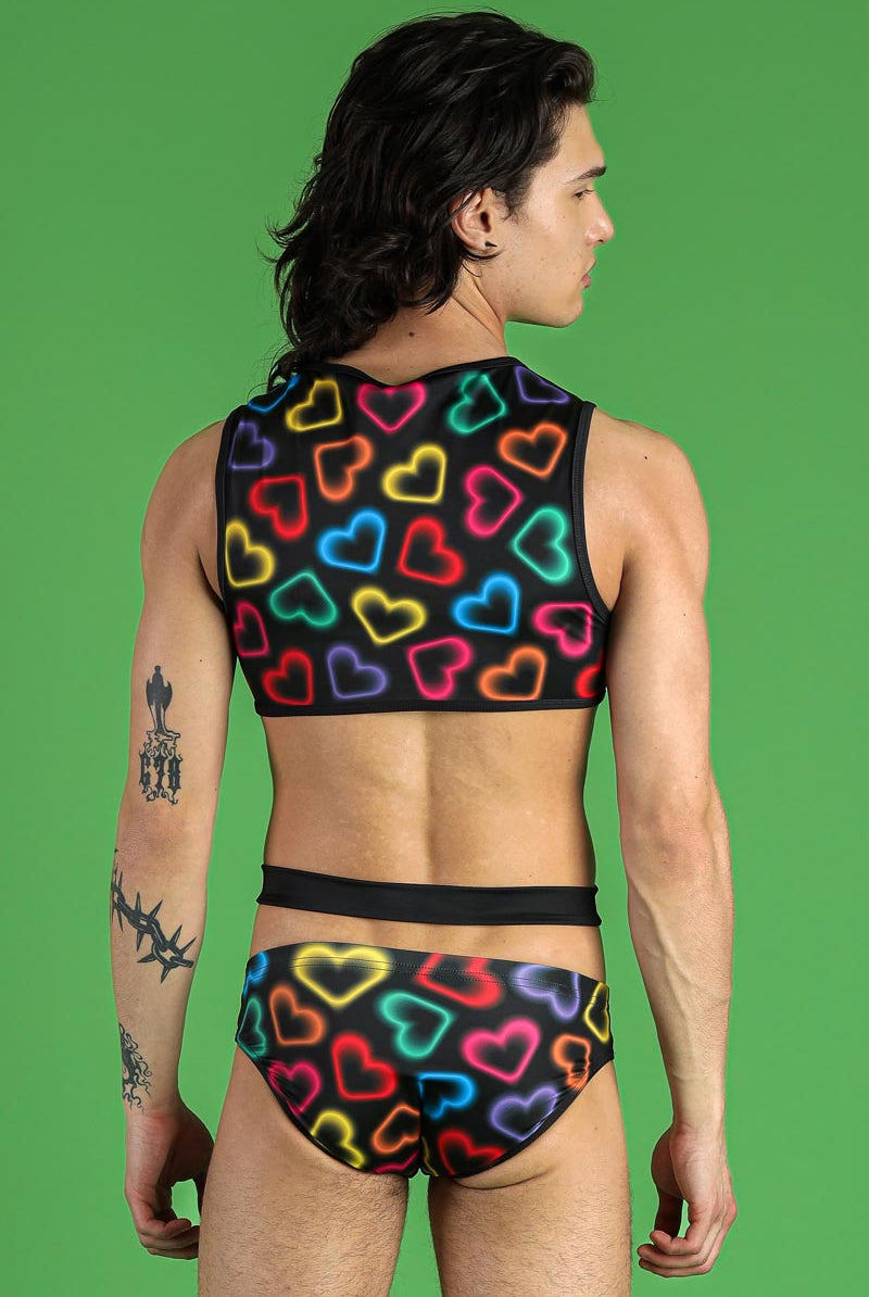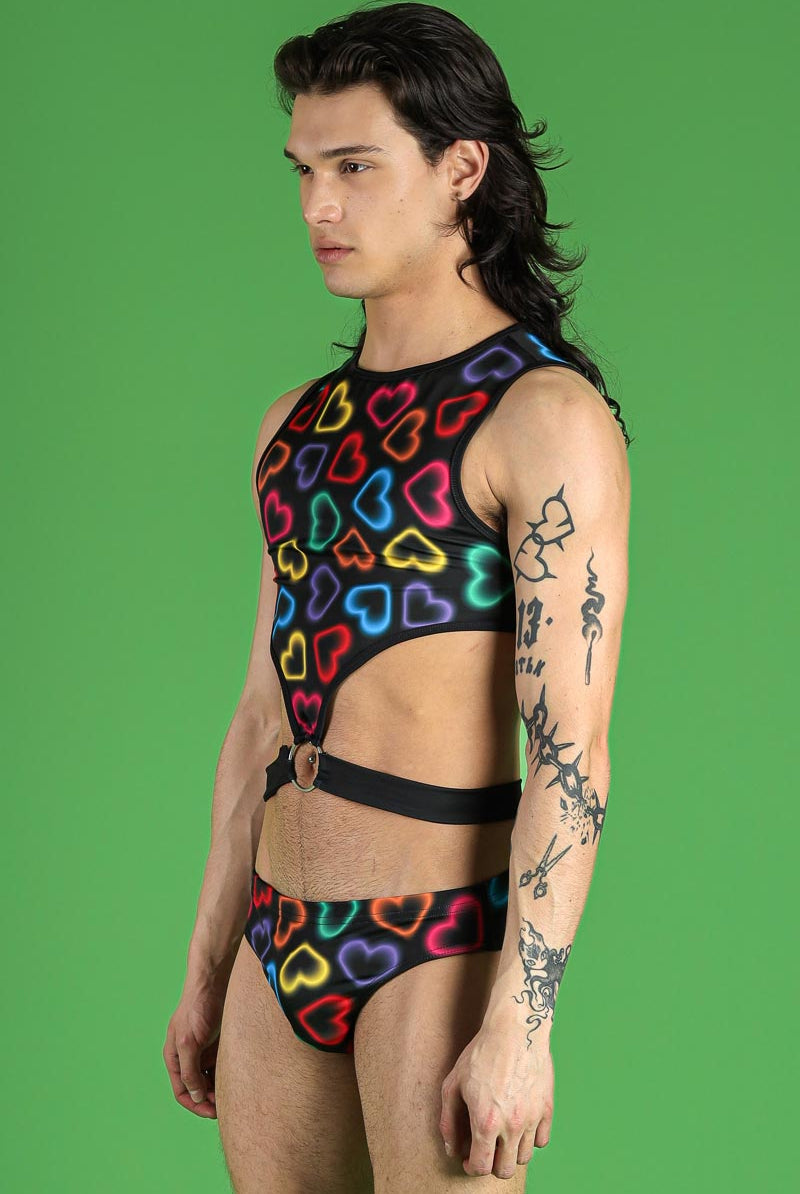 Make a bold statement with the men's o-ring tank and snug briefs set. This set includes the eye-catching o-ring cut-out tank top paired with the snug, low-rise briefs, both featuring the vibrant Neon Hearts design. The top's unique cut-out details and high neckline complement the sleek, supportive fit of the briefs, creating a look that is both daring and comfortable. Perfect for pride events, raves, and other festivals, this set ensures you'll be turning heads and expressing your true self. Embrace the vibrant energy of our pride collection with this striking ensemble.