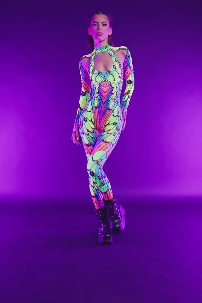 Turn heads in the Neon Nymph catsuit with UV-reactive wings pattern in vibrant neon hues, designed to glow under the lights. The keyhole neckline and flare sleeves add a touch of playful drama. Bold, edgy, and made for raves and Halloween parties—this outfit guarantees you'll own the night!