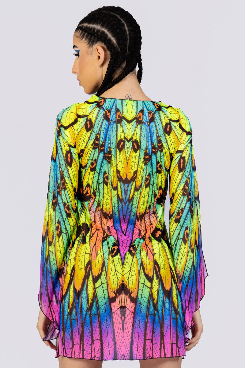 This mesh slit mini dress is a full-spectrum fantasy. With flowing winged sleeves and a radiant rainbow butterfly print, it glows under UV light and moves like magic on the dance floor. Lightweight, daring, and made to stun—slip it on and own the rave.