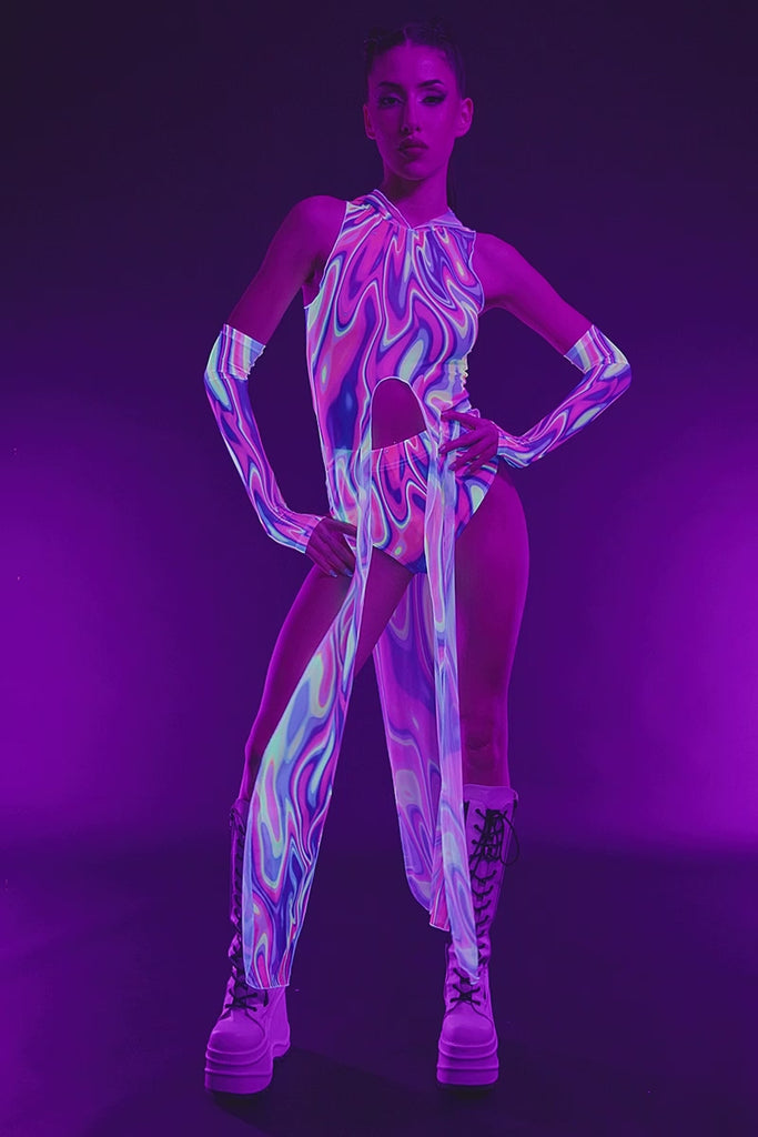 Get rave-ready in this psychedelic dream set—complete with a hooded tunic top, arm warmers, and high-waisted booty shorts. The juicy swirl of pink, yellow, and electric blue wraps u in hypnotizing heat, while the curve-hugging fit screams celestial chaos. One look and you're untouchably iconic. Let ‘em stare.