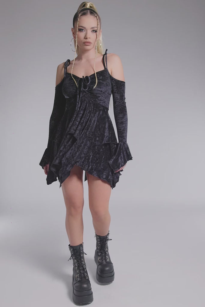 Turn heads and capture hearts in this seductive black velvet fairy dress. With its soft, flowing ruffles and daring tie-front design, this dress perfectly blends playful charm with bold elegance. The plush velvet offers unmatched comfort while adding a touch of luxury. Step into your power and let your confidence shine!
