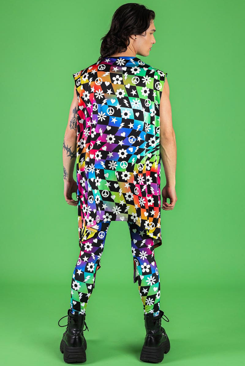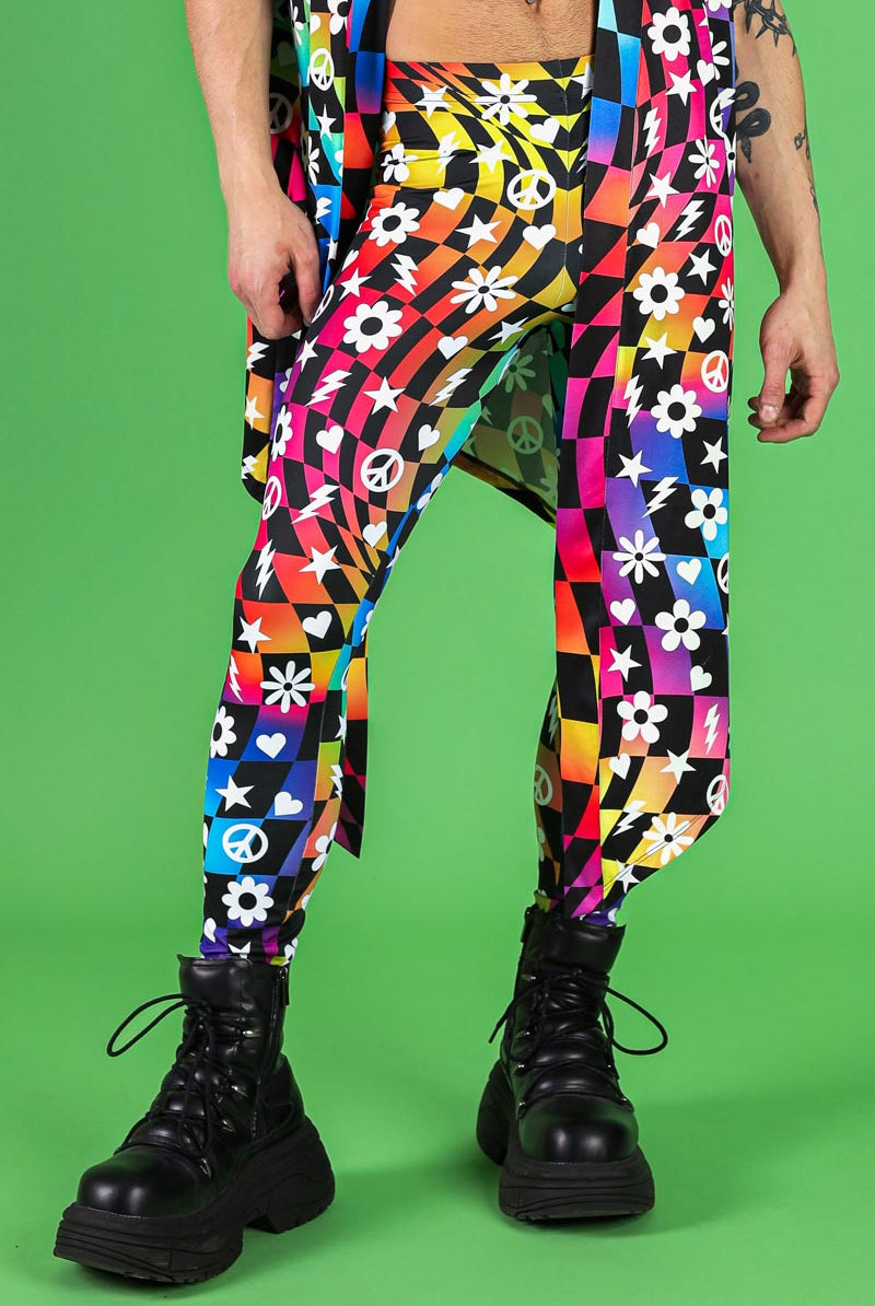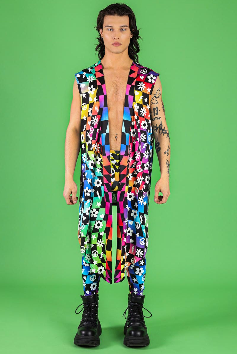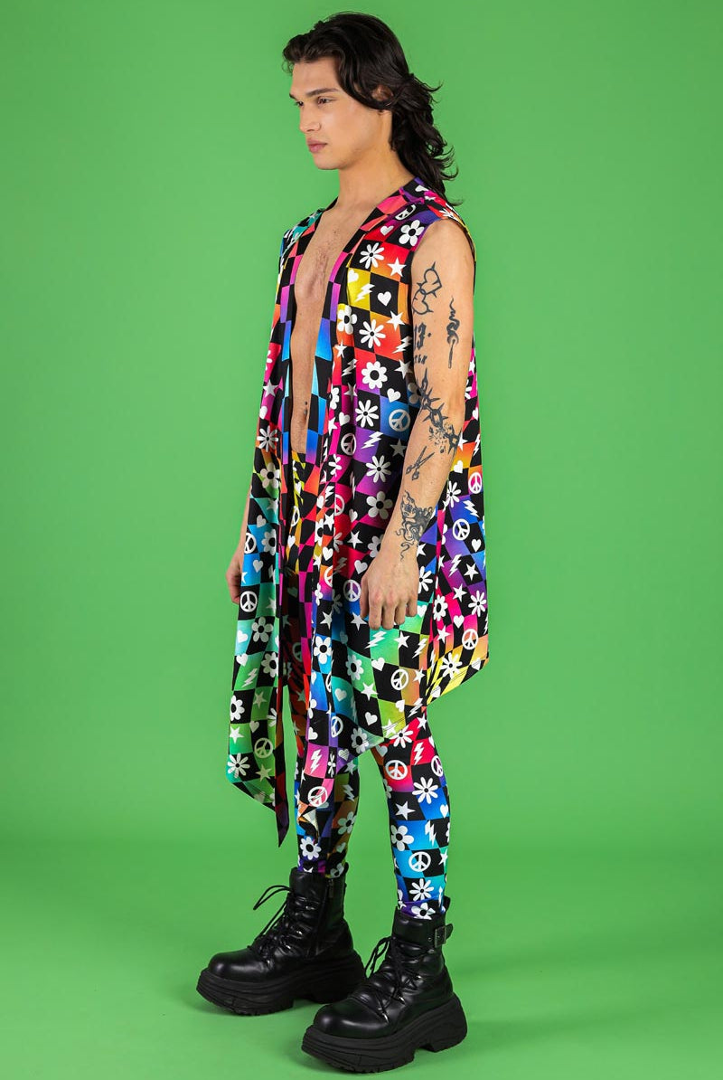 Get ready to turn heads with this complete ensemble featuring the Peaceful Love pattern, part of our pride collection. The set includes a men's kimono top and matching leggings, each piece adorned with colors and symbols of peace and love. The sleeveless kimono's open-front design pairs perfectly with the snug, form-fitting leggings, creating a cohesive look that’s both stylish and expressive. Embrace the spirit of unity and self-expression with this vibrant, eye-catching outfit.