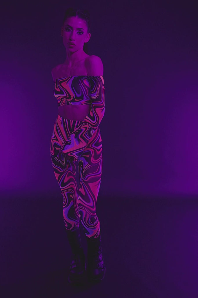 Serve celestial heat in this peach cut-out crop top with long, bell-shaped sleeves that flirt with every flick of your wrist. Hypnotizing swirls in molten pinks and purples kiss your curves with a second-skin fit. A total rave outfit slay. Show up. Stand out. Own the damn galaxy.