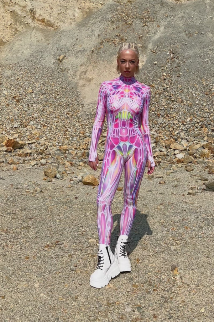 Unleash your inner rave queen with this vibrant costume. This rave costume features a high neck and a zip-up front, ensuring a snug fit that moves with you. The pink pattern guarantees you'll stand out in any crowd. The sleek design hugs your curves, with thumb holes in the sleeves for added flair.