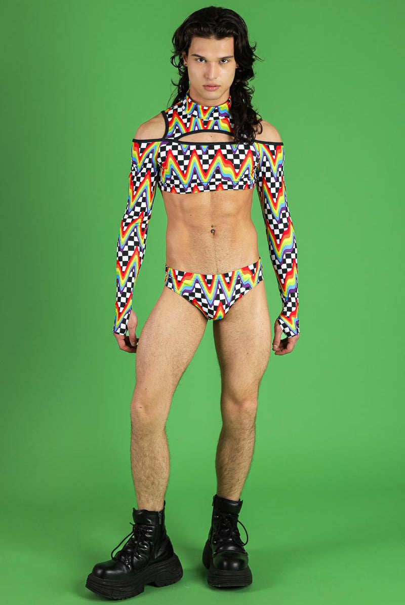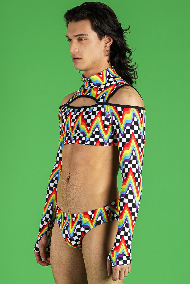 Unleash your vibrant side with this eye-catching men's cold-shoulder crop top. Featuring a unique Queer Cheer pattern, this top showcases bold rainbow zigzags interlaced with black and white checkered designs. The high neckline adds a touch of sophistication, while the cold-shoulder cutouts provide a daring, stylish edge. Perfect for festivals, raves, and pride events, this top is designed for those who love to stand out.
