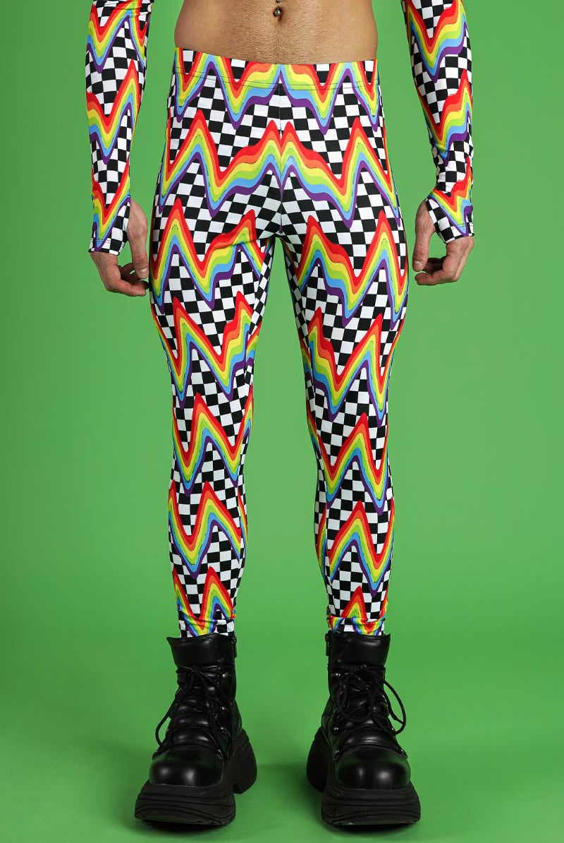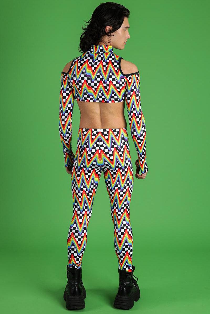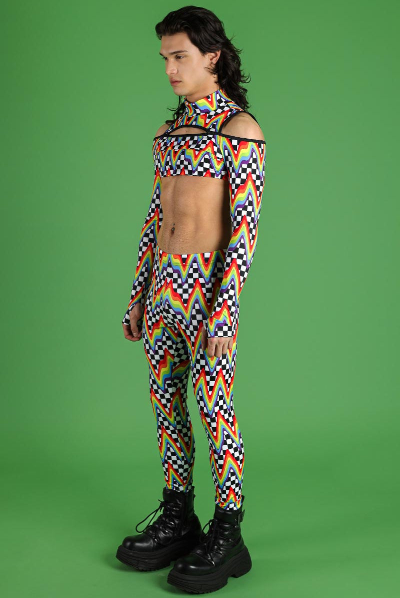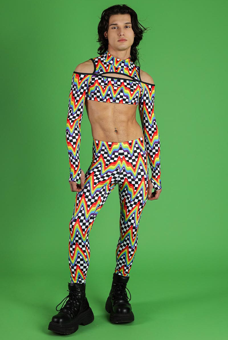 Make a bold statement with this matching set, featuring a men's cold-shoulder crop top and leggings in the striking Queer Cheer pattern. The crop top boasts a high neckline and cut-out shoulders, providing a stylish and edgy look, while the leggings offer a comfortable, high-waisted fit. Both pieces are decorated with the dynamic Queer Cheer print, a vibrant mix of zigzag and checkered patterns in rainbow colors, perfect for any pride, rave, or festival. Celebrate your pride and individuality with this standout set, designed to keep you looking and feeling fantastic.