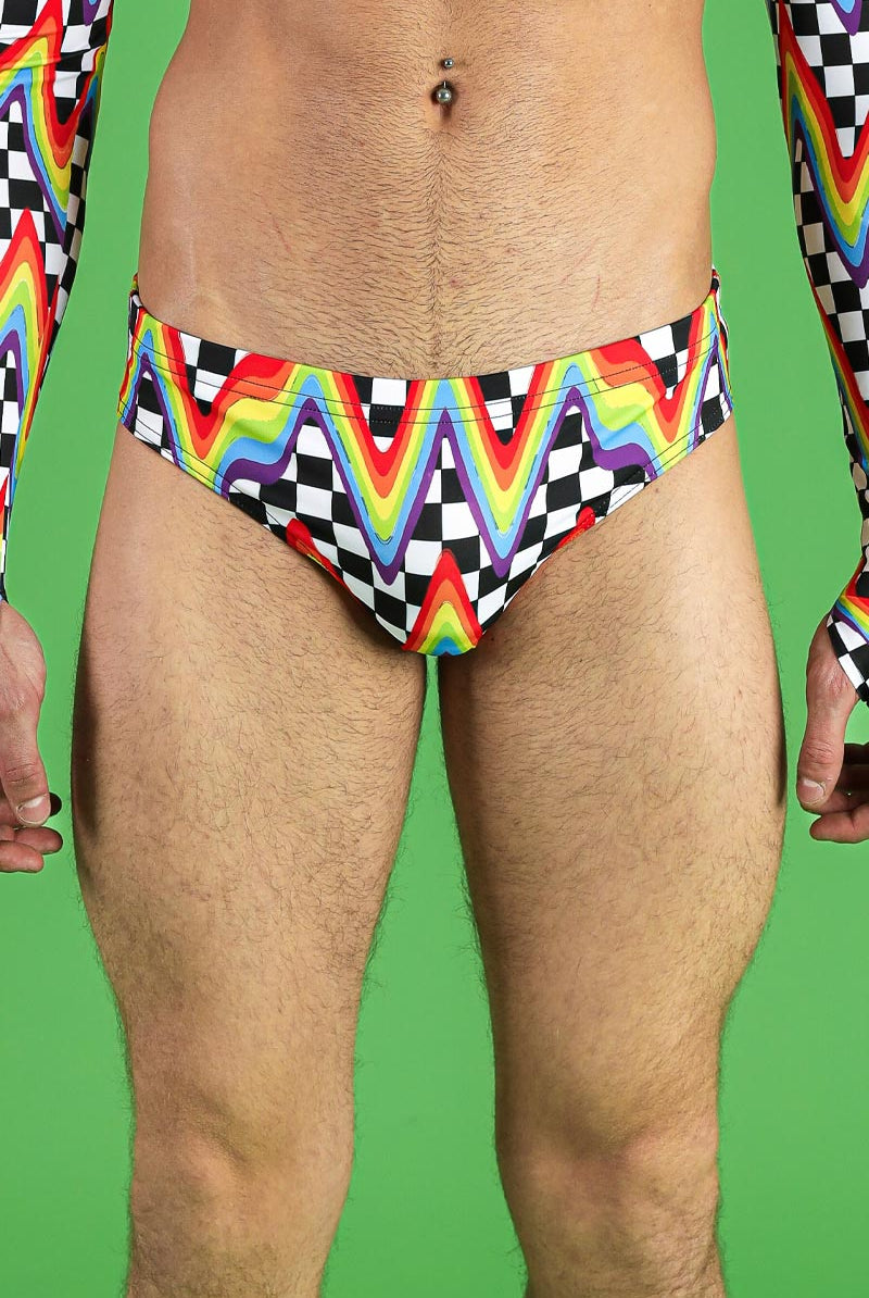 Embrace your bold style with these men's low-rise snug briefs. Adorned with the striking Queer Cheer print, these briefs feature a vibrant combination of rainbow zigzags and black and white checks. The low-rise design offers a comfortable and flattering fit, ideal for any festival or pride event. Made with soft, stretchy fabric, these briefs provide both comfort and style, making them a must-have addition to your pride wardrobe.