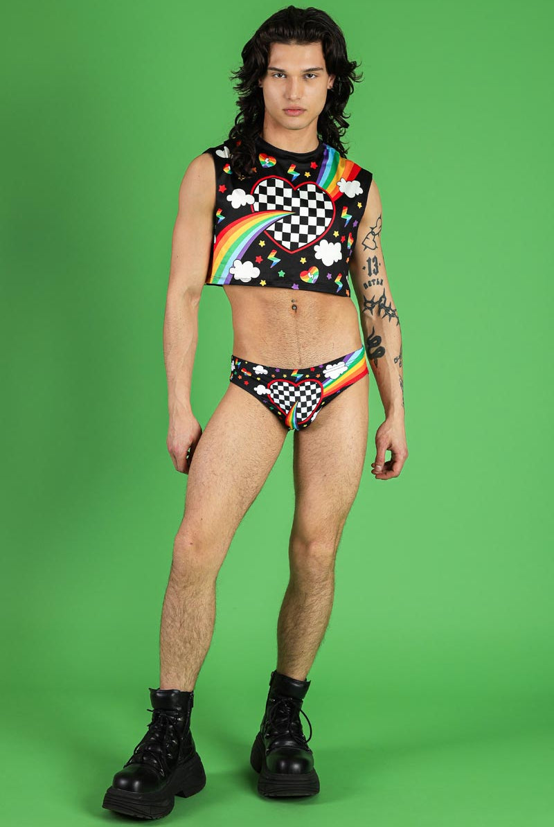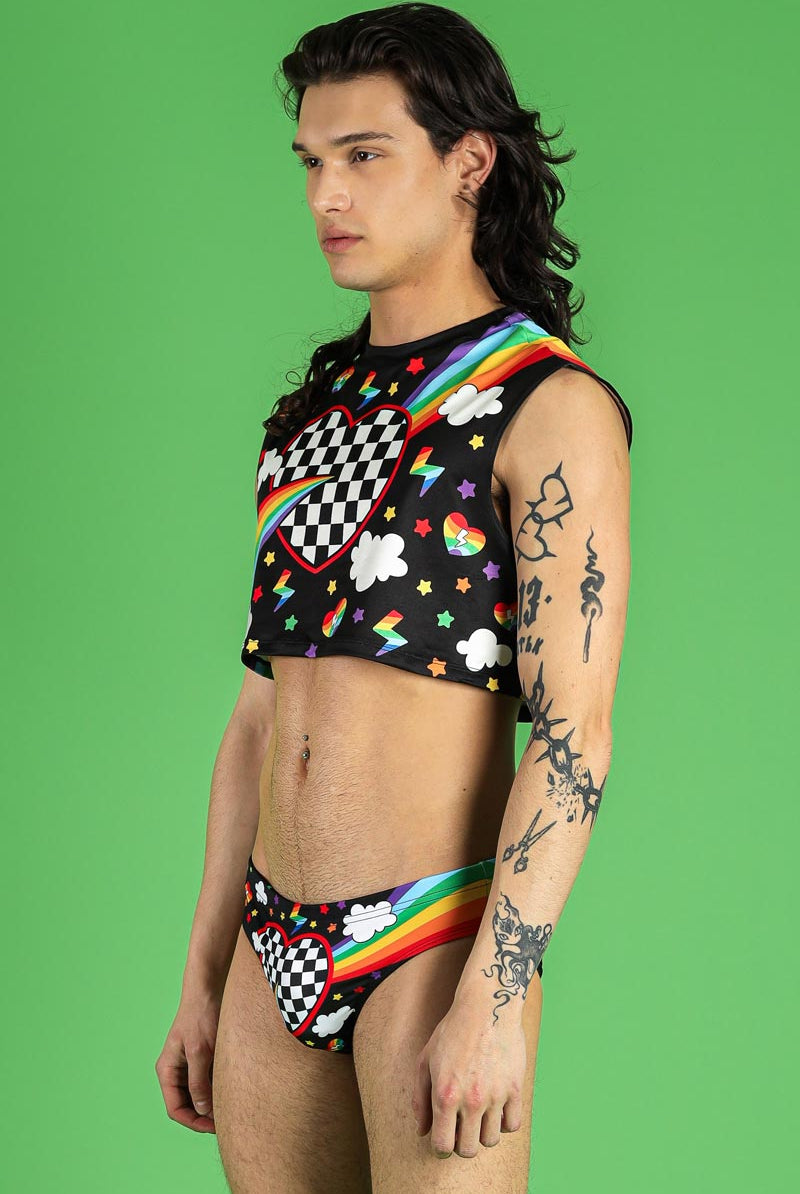 Step into the spotlight with our men's tank crop-top featuring the vibrant Queertastic pattern. This sleeveless top has a high, round neckline and a cropped fit that accentuates your physique. The bold print displays rainbows, stars, clouds, and checkered hearts against a black background, making it perfect for expressing your pride and individuality. Crafted for comfort and style, this crop-top is a must-have for pride events, raves, and festivals.