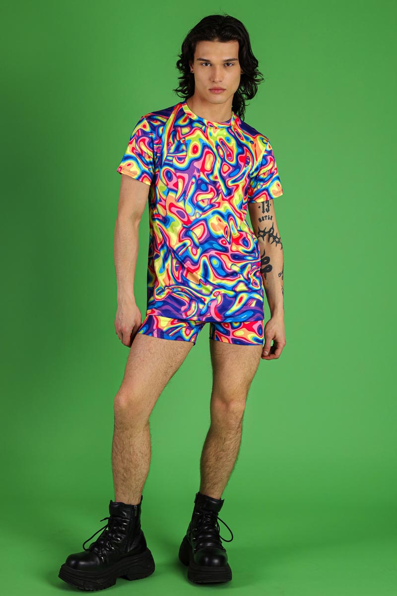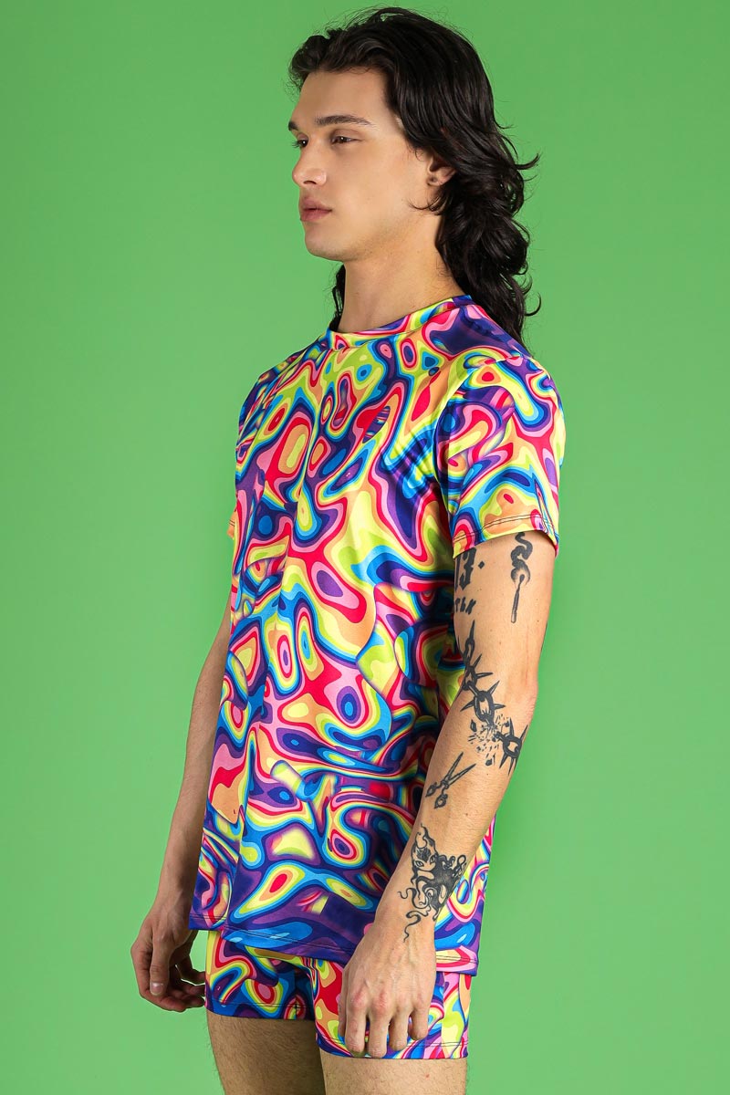 This vibrant male tee features the mesmerizing Rainbow Dreams design, making it an ideal choice for pride, rave, and festival outfits. The shirt boasts a classic crew neckline, providing both comfort and style. The colorful print, with its swirling patterns and dynamic colors, ensures you stand out in any crowd. Crafted from breathable, high-quality fabric, this tee promises comfort throughout the day, keeping you cool and stylish.
