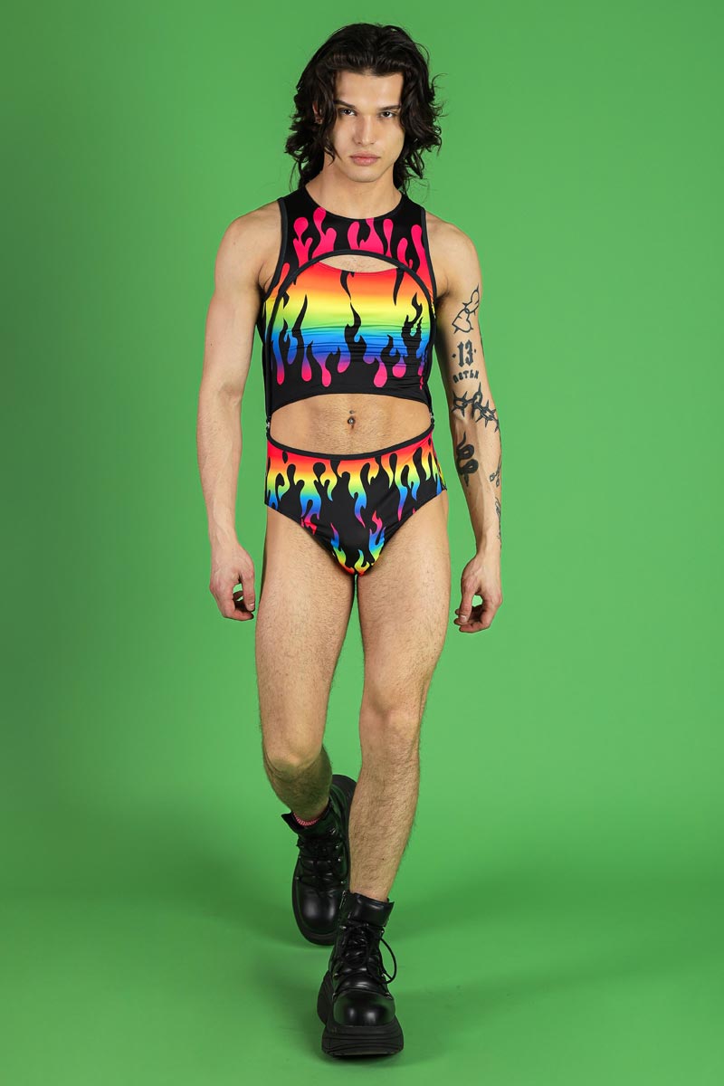 Amp up your festival look with this striking men's two-piece bodysuit, ideal for pride events, raves, and festive gatherings. Adorned with the eye-catching Rainbow Flames design, this unique outfit comprises two pieces connected seamlessly by metal hooks on either side of the torso. The bodysuit features a keyhole cut-out on the top and additional cut-outs, adding an edgy flair. Celebrate your individuality and pride in bold style with this standout ensemble.