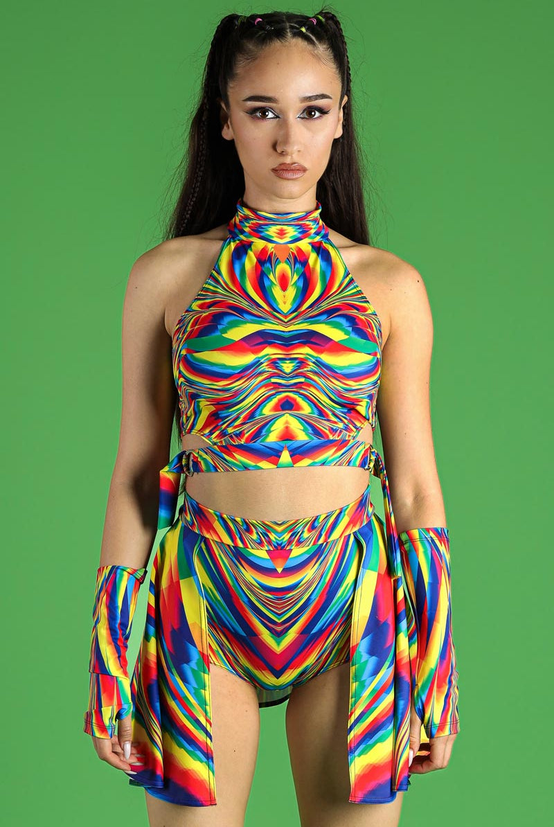 This stunning set pairs the high-neck crop top with the innovative backside shorts skirt, both adorned with the Rainbow Glitch print, ideal for making a statement at any pride or rave festival. The top’s back zipper and distinct belt align seamlessly with the skirt’s playful yet secure design. Together, they create a harmonious look that's both eye-catching and functional, ensuring you're festival-ready in no time.