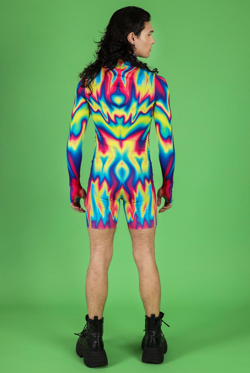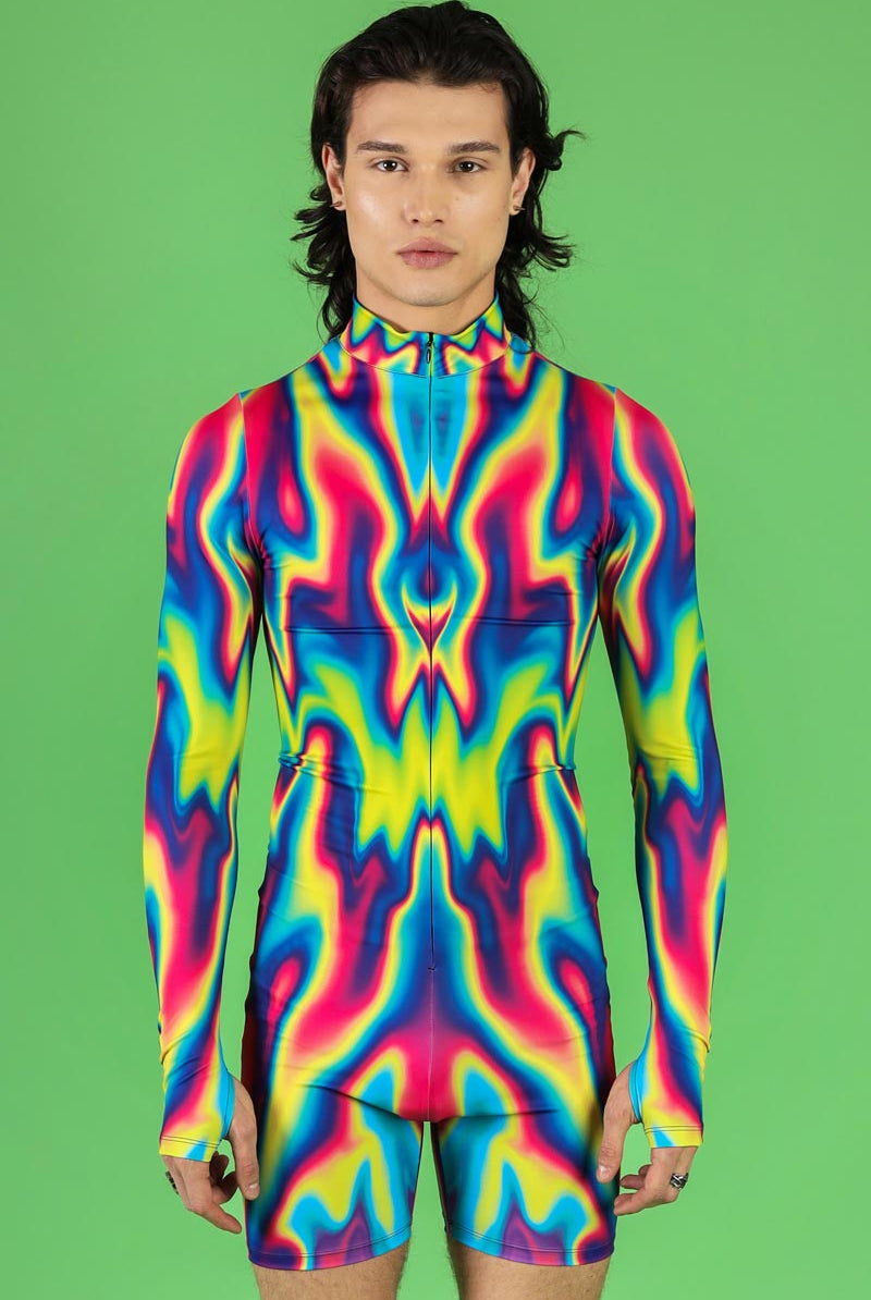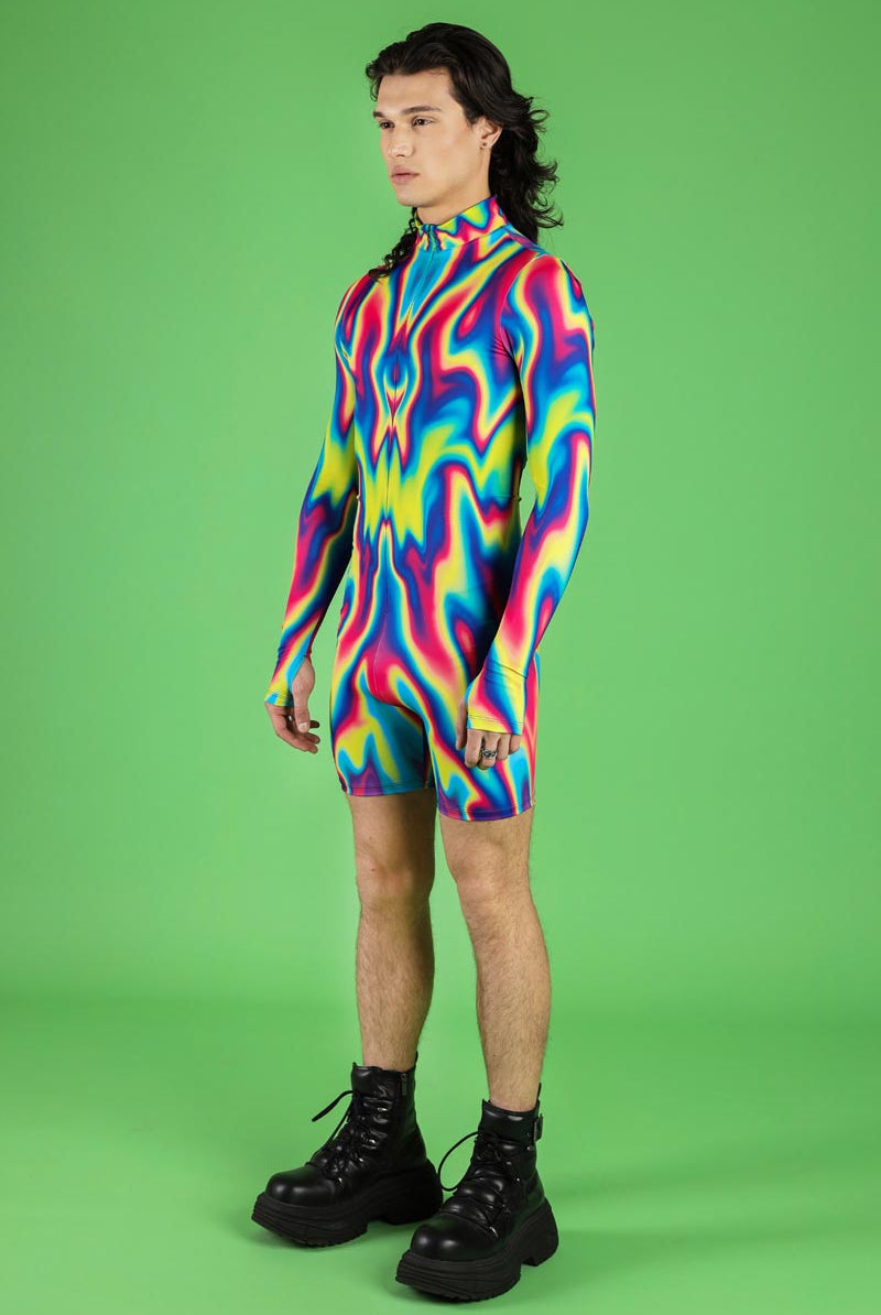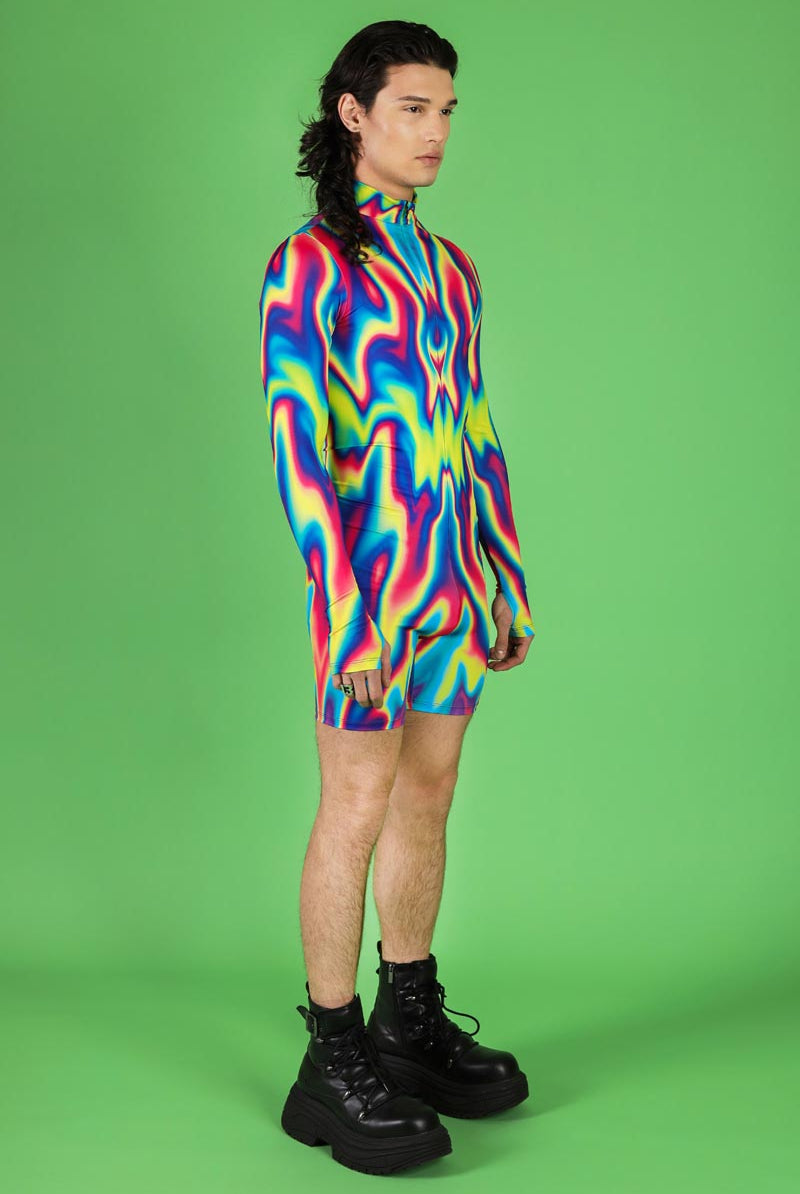 Elevate your festival attire with this striking men's romper, perfect for pride events, raves, or any festive celebration. This romper features a dynamic Rainbow Liquid pattern, capturing vibrant hues and energetic waves in its design. Crafted for comfort and style, it includes a high neckline and a secure zip-up front fastening, ensuring ease of wear and a snug fit. Long sleeves and a short bottom provide a unique, modern silhouette that is both bold and functional. Celebrate individuality and pride in a standout piece that combines fashion-forward design with the spirit of festivity.