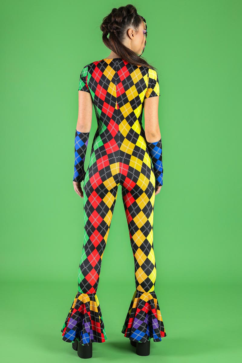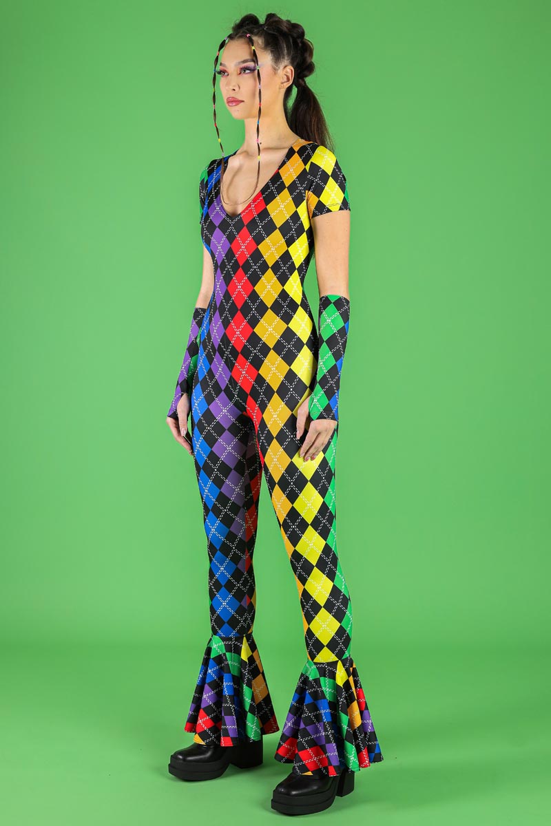 Step up your festival fashion game with this vibrant v-neckline bell-bottom jumpsuit, perfect for pride events, raves, or any festive occasion. Adorned with the dynamic Rainbow Plaid pattern, this jumpsuit features short sleeves and stylish bell-bottom legs. The plunging V-neckline adds a touch of flair, while the fabric ensures a comfortable fit for all-day wear. This standout piece is part of our pride collection, designed to celebrate individuality and pride with bold, eye-catching style.