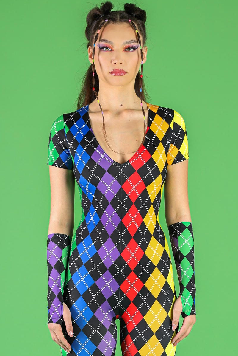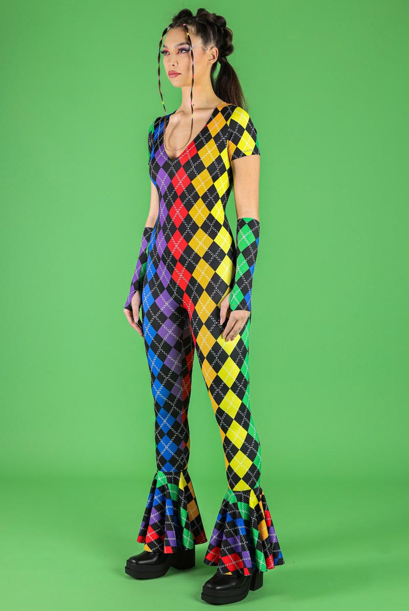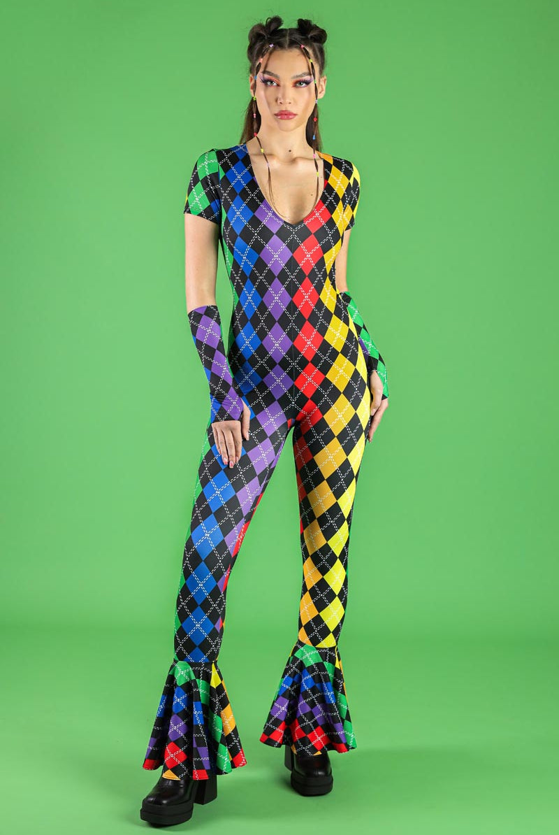 Step up your festival fashion game with this vibrant v-neckline bell-bottom jumpsuit, perfect for pride events, raves, or any festive occasion. Adorned with the dynamic Rainbow Plaid pattern, this jumpsuit features short sleeves and stylish bell-bottom legs. The plunging V-neckline adds a touch of flair, while the fabric ensures a comfortable fit for all-day wear. This standout piece is part of our pride collection, designed to celebrate individuality and pride with bold, eye-catching style.