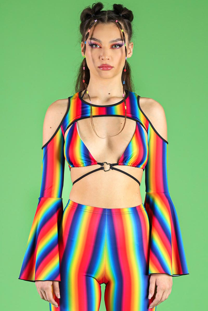 This dazzling ensemble combines the playful strappy bikini top with heart ring and the striking high-waisted bell-bottoms, both adorned in the Rainbow Spectrum pattern. Together, they echo the vibe of the '70s, creating a cohesive look full of vibrant colors and dynamic energy, perfect for those looking to make a bold fashion statement. Whether you're hitting a music festival or just cruising around town, this set ensures you'll capture attention with every step.