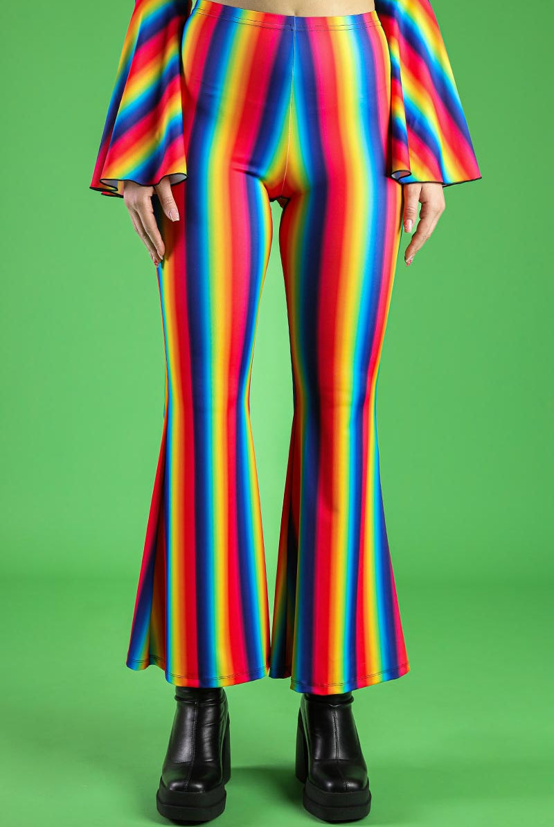 Step out in style with these eye-catching high-waisted bell-bottoms in a Rainbow Spectrum pattern. The pants are making a bold statement with their wide, flaring legs that echo the free-spirited vibe of the '70s. Ideal for adding a pop of color to your wardrobe, these bell-bottoms pair perfectly with both simple tops and more extravagant accessories.