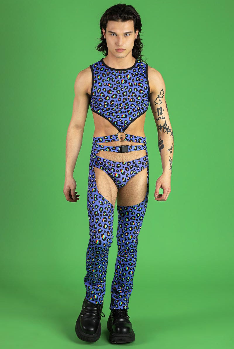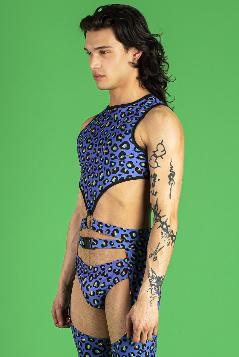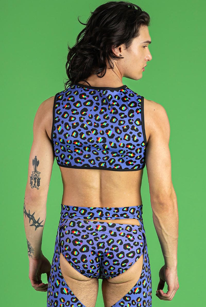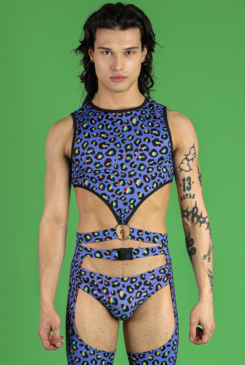Embrace your bold style with this men's o-ring cut-out tank top, featuring the vibrant Rainbow Spots pattern. This sleeveless crop top showcases a distinctive cut-out design at the midriff, accentuated by an eye-catching O-ring detail at the front. The scoop neckline offers a comfortable fit, while the unique leopard print adds a pop of color perfect for any pride event or festival. Crafted from a high-quality, stretchable fabric, this top ensures both style and comfort, making it a standout piece in your wardrobe.
