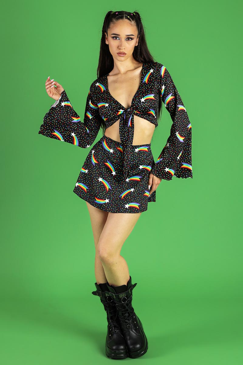 This eye-catching ensemble pairs a long-sleeved tie-knot crop top with a matching high-waisted flared skirt with built-in shorts. Both pieces boast a vibrant rainbow print against a dark background, creating a cohesive and striking look. The top's flared sleeves and front tie-knot design harmonize with the skirt’s playful flare, making this set a fabulous choice for those looking to make a bold fashion statement with a touch of whimsy.
