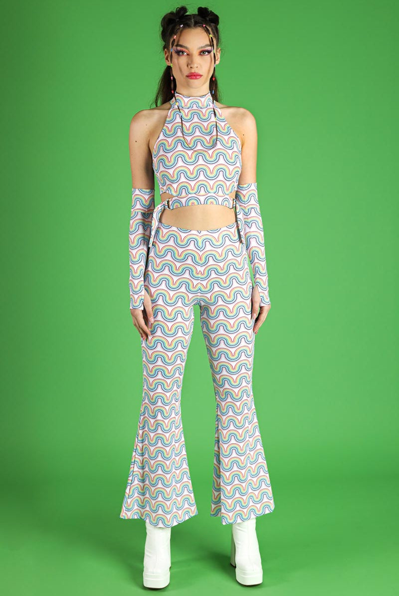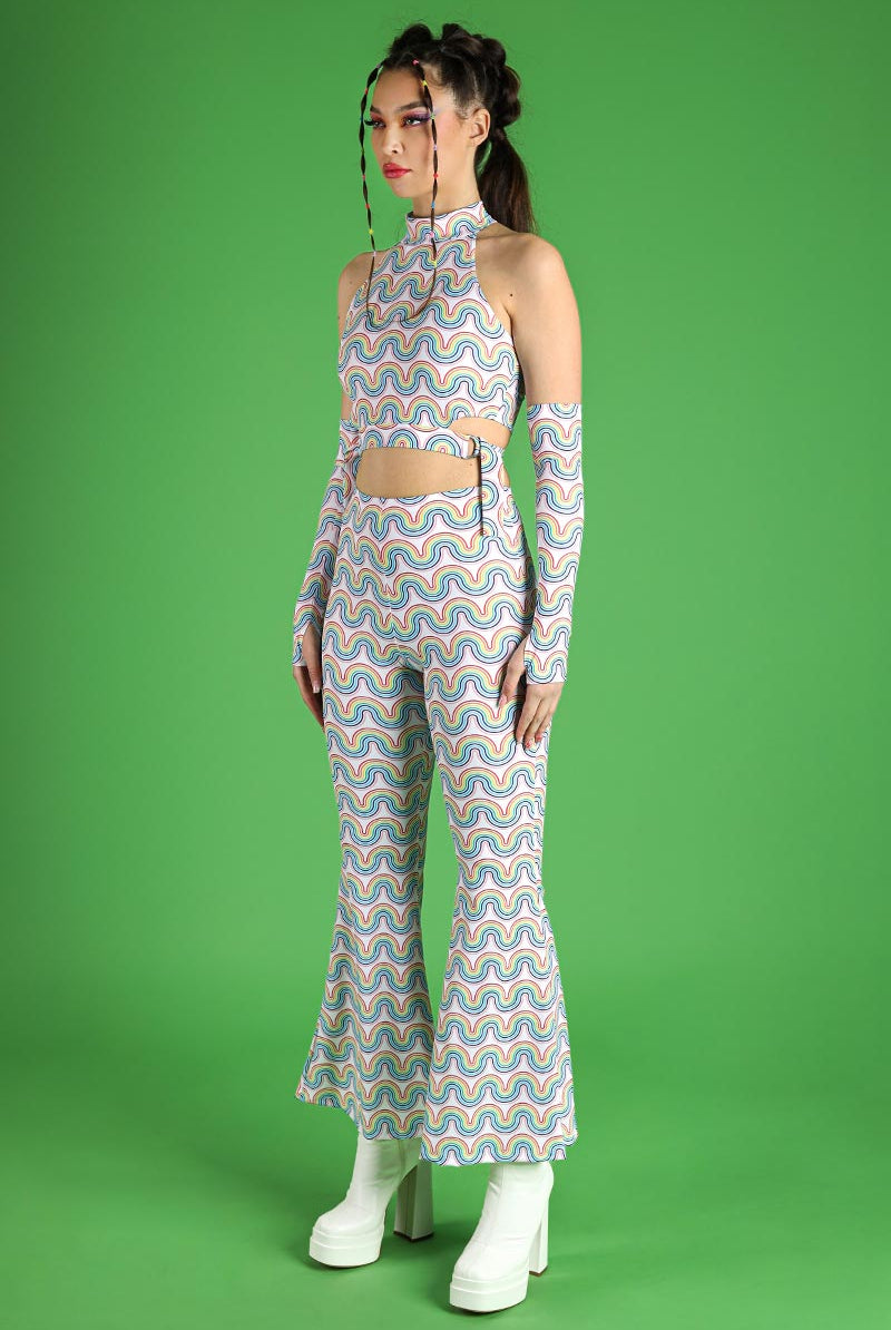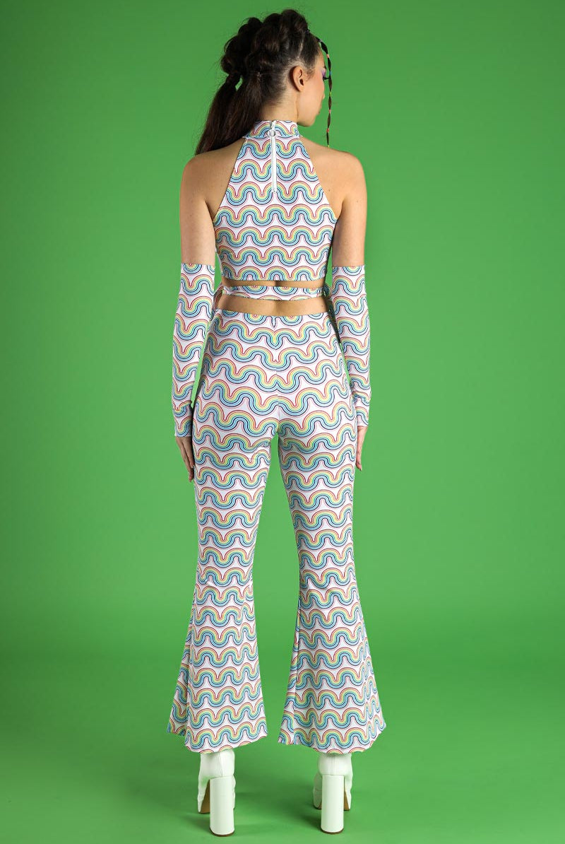 Capture the essence of the '70s with these high-waisted bell-bottoms adorned with the Rainbow Waves print. These pants combine a retro vibe with modern flair, making them ideal for making a statement at a pride or rave festival. The flared silhouette and vibrant pattern ensure you'll stand out while celebrating in style.