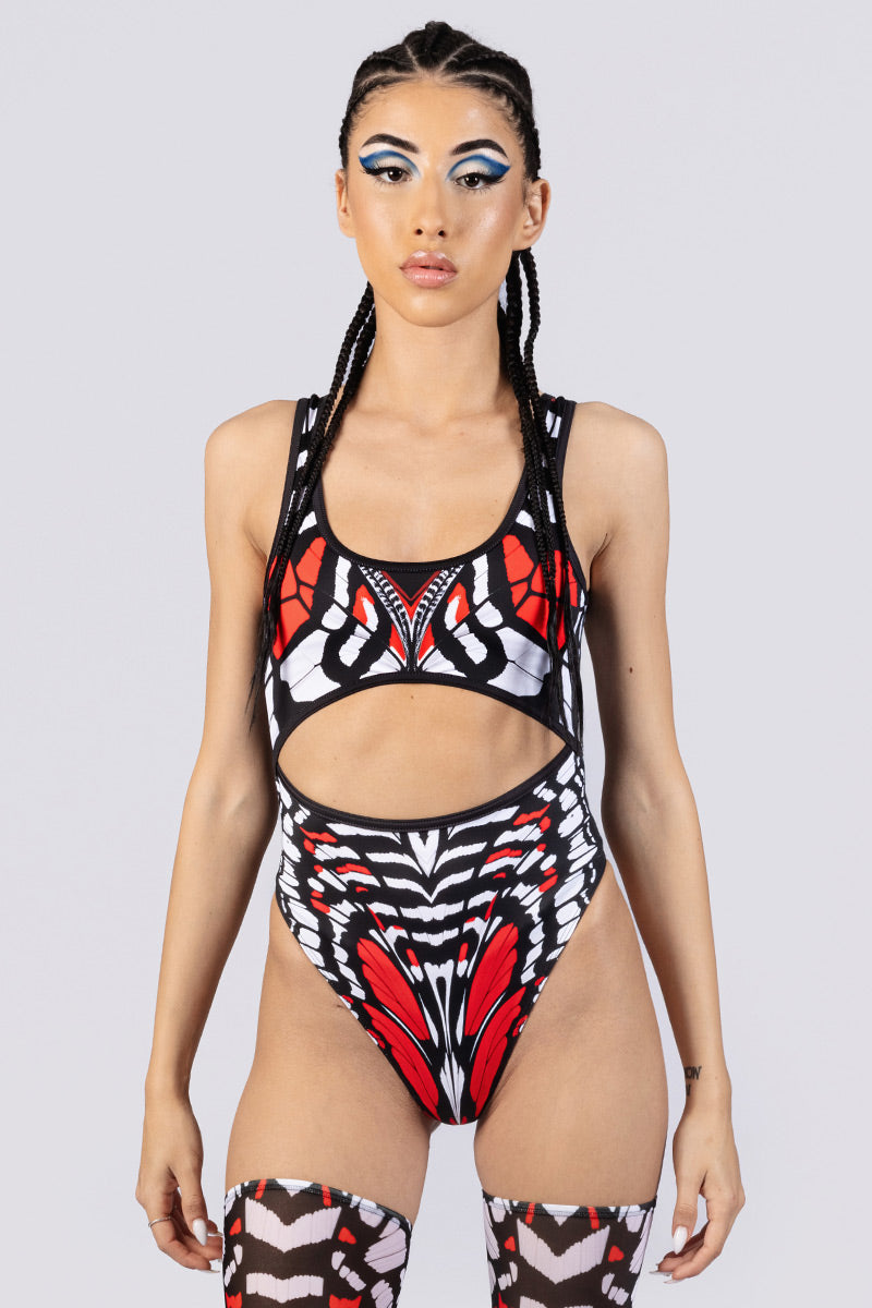 This fiery cut out thong bodysuit is here to slay every festival stage and rave floor. With a daring front cutout, bold monarch print, and a cheeky high-leg silhouette, it’s made for butterflies who bite back. Be fierce, fearless, and totally unforgettable. Snag your wings and take flight!