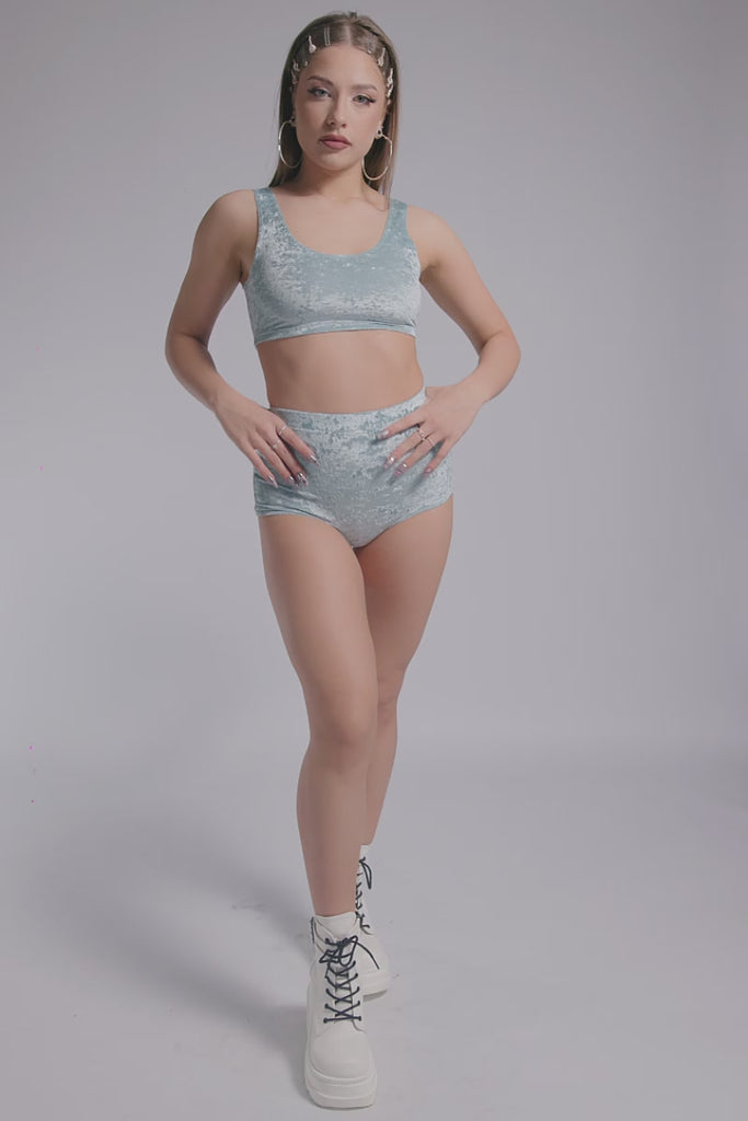 Elevate your style with these light blue velvet booty shorts, designed to showcase your confidence. The soft, smooth velvet hugs your body comfortably, offering a flattering fit that moves with you. Own your look and rock the vibe!