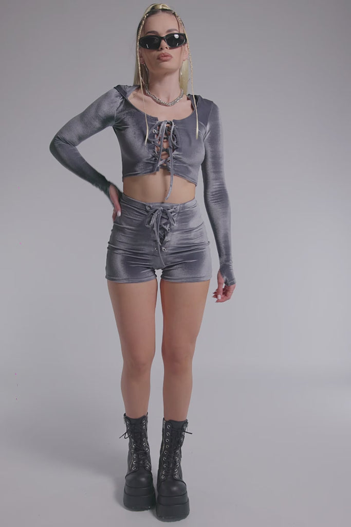 Silver Sass Long Sleeve Lace Up Crop Top - Gray Velvet