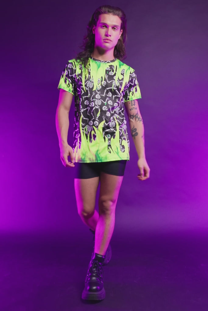 Turn heads in the Skeletons in Wildfire male tee! Neon green flames clash with a chaotic skeleton print, and it all glows under UV light. This tee is built for those who wanna bring the heat and stand out in the crowd. Ready to own the night? Cuz this look is pure fire.