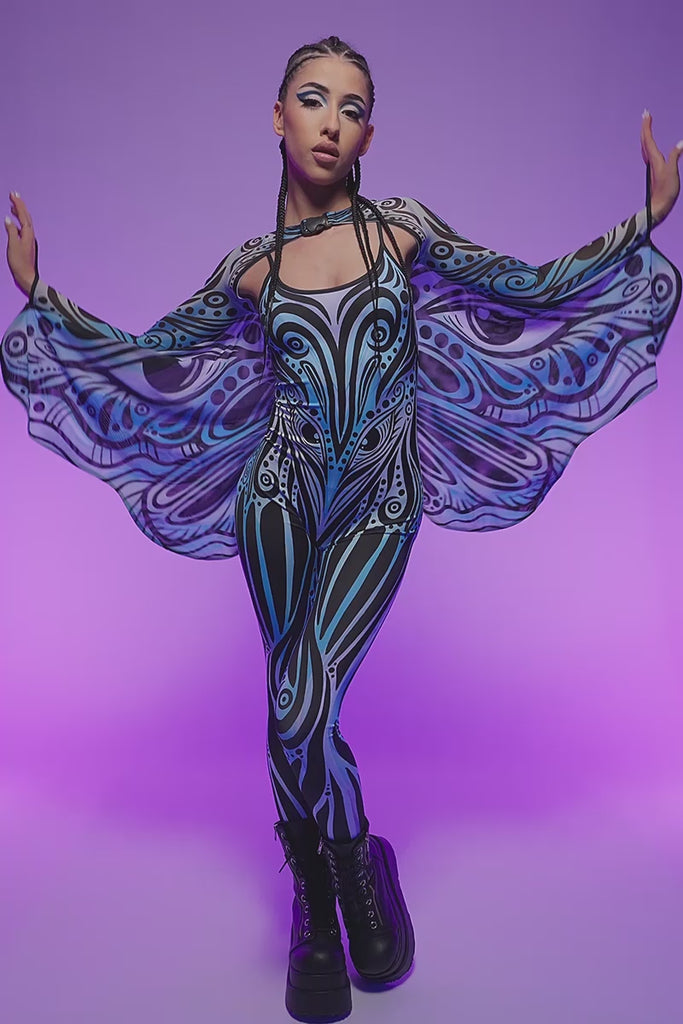 These top wings bring high-drama energy to any rave outfit. With a bold black and blue butterfly print and flowy mesh design, they flutter with every move and transform your look into pure festival fantasy. Light, fierce, and made to stun—slip them on and take over the night.