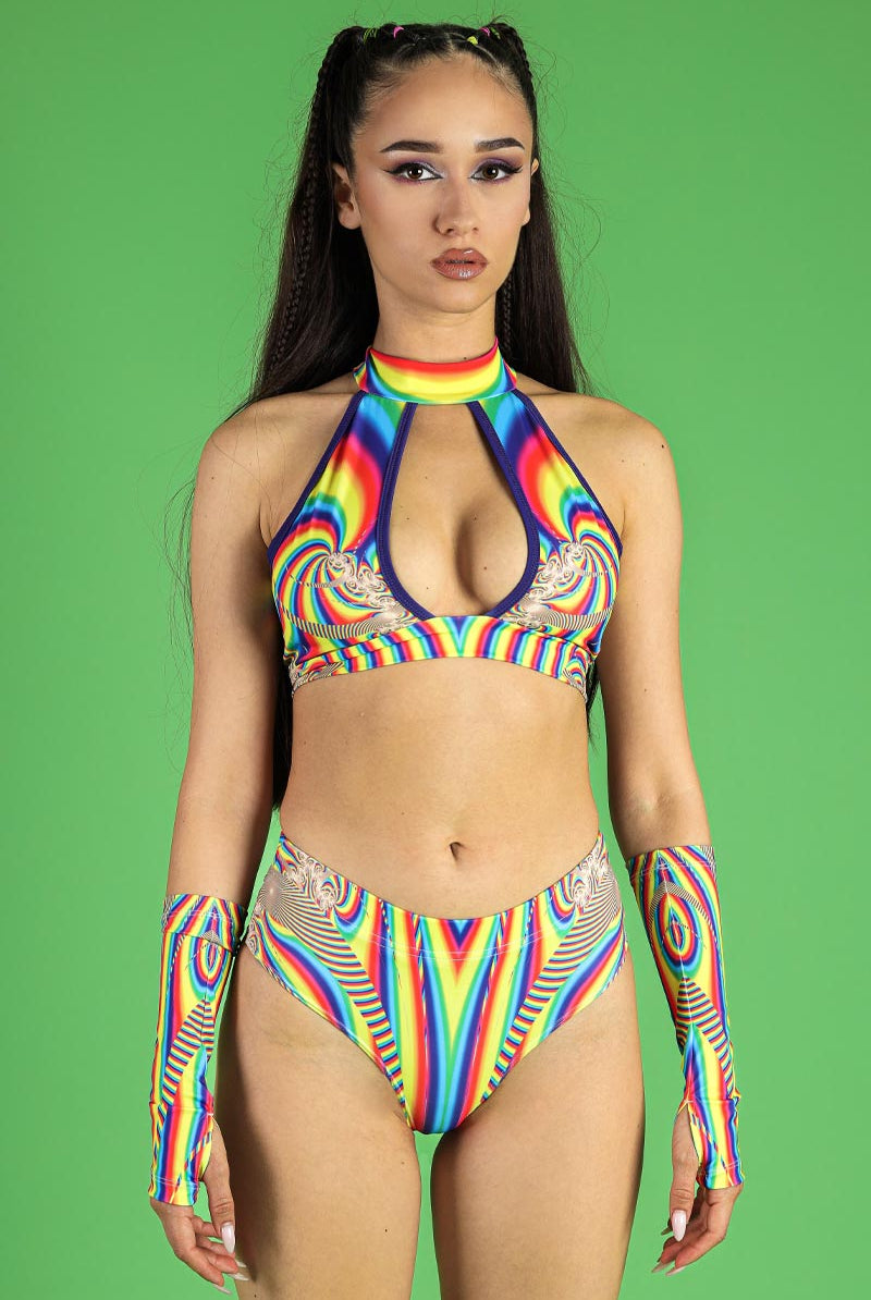 These thong shorts, featuring the Spectral Spin pattern, are perfect for making a bold statement at any pride, rave, or festival event. Made from a comfortable, stretchy fabric, these shorts ensure a snug yet flexible fit. The minimal coverage at the back adds an edgy touch, making them an ideal choice for those who love to stand out. As part of our pride collection, these pieces celebrate diversity and individuality.
