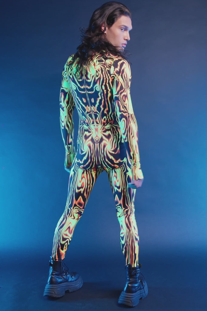 Light up the night in the Starburst men's costume. This bold, UV-reactive suit zips up the front and glows under blacklight, showing off its striking, trippy design. With a sleek fit and high neckline, it's made for standing out in any crowd. Get ready to command attention with every move!