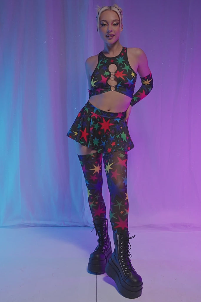Cosmic chaos never looked this cute—this rainbow set features a ring-detailed crop top, flirty mini skirt, matching leg wraps and arm warmers that scream main character energy. Stretchy, secure, and dance-floor ready, it’s made for fearless queens who don’t just show up—they steal the spotlight.