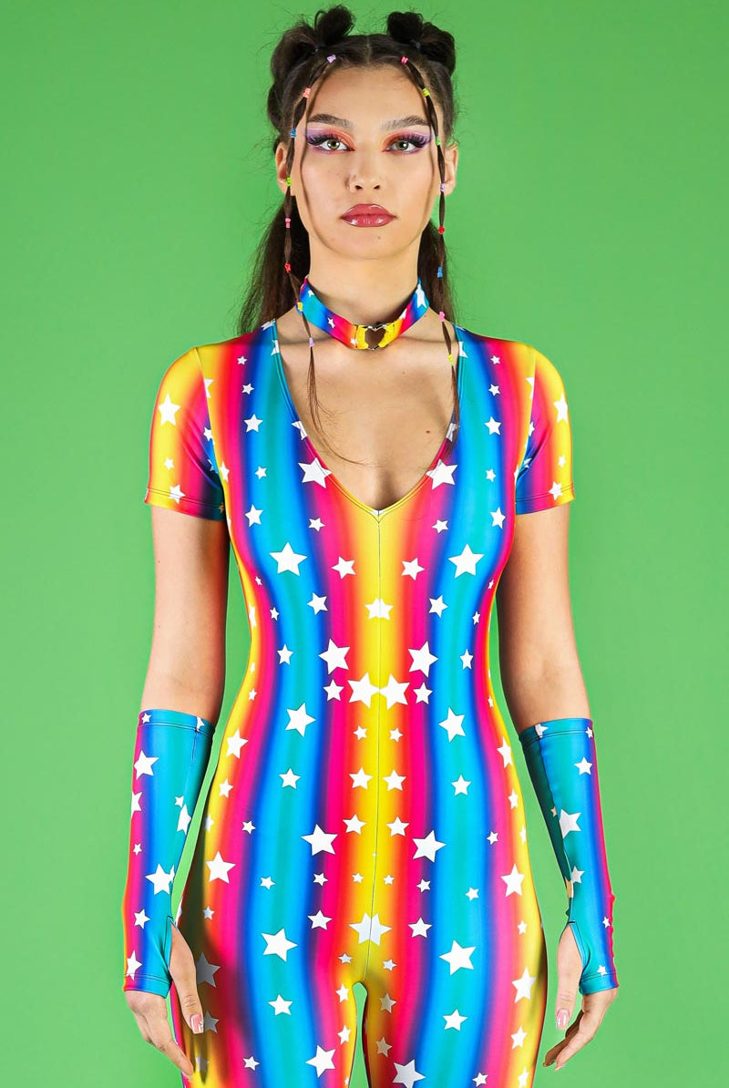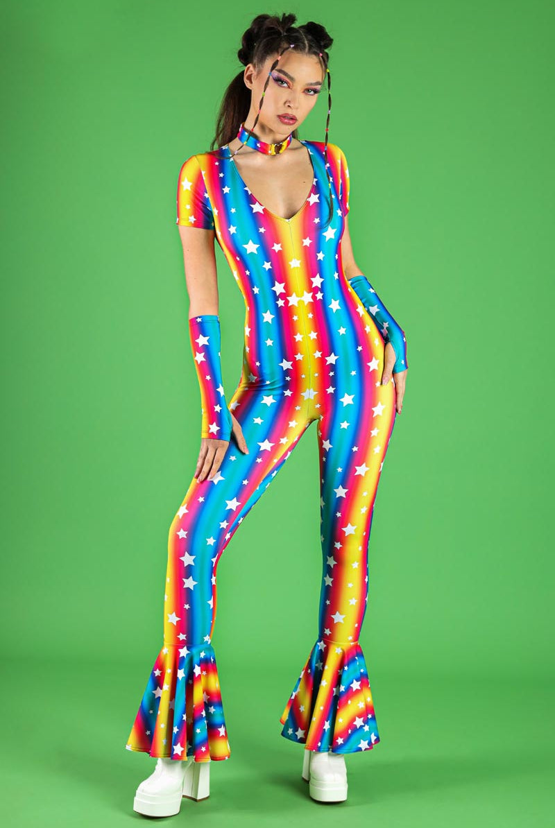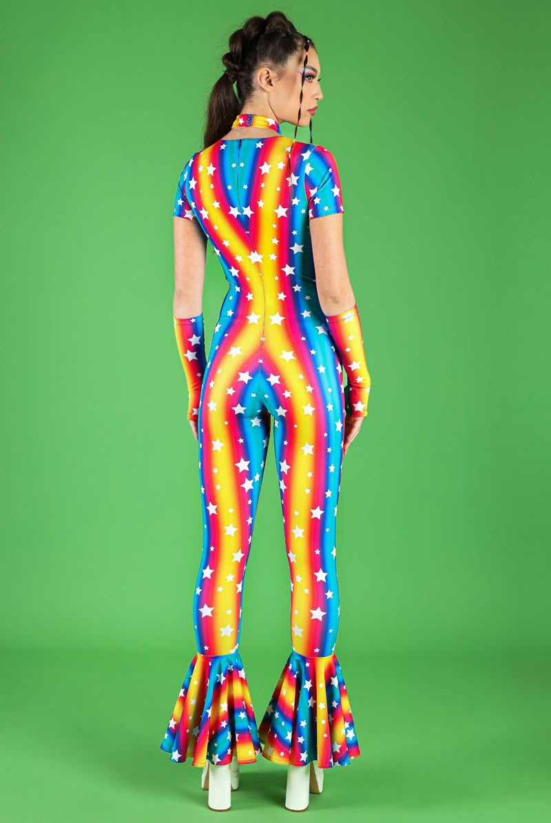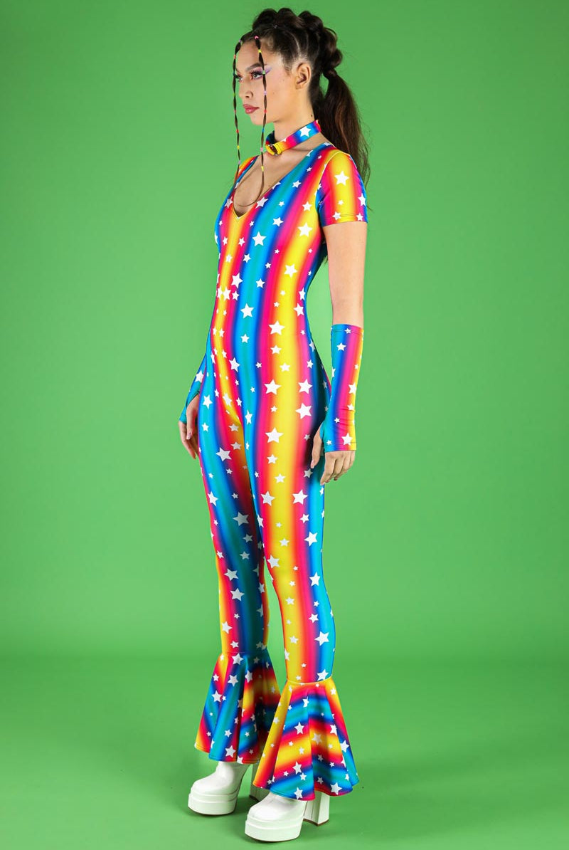 Step up your festival fashion game with this v-neckline bell-bottoms jumpsuit, designed with a vibrant Stars Parade pattern. This jumpsuit pairs with sleeves and a choker, adding a unique touch to the ensemble. The v-neckline provides a flattering fit, while the bell-bottoms create a '70s retro-inspired look. Perfect for pride events, raves, and other festive occasions, this jumpsuit is part of our pride collection, celebrating individuality and style. The jumpsuit ensures a comfortable fit with its soft, stretchy fabric, making it ideal for dancing the night away.