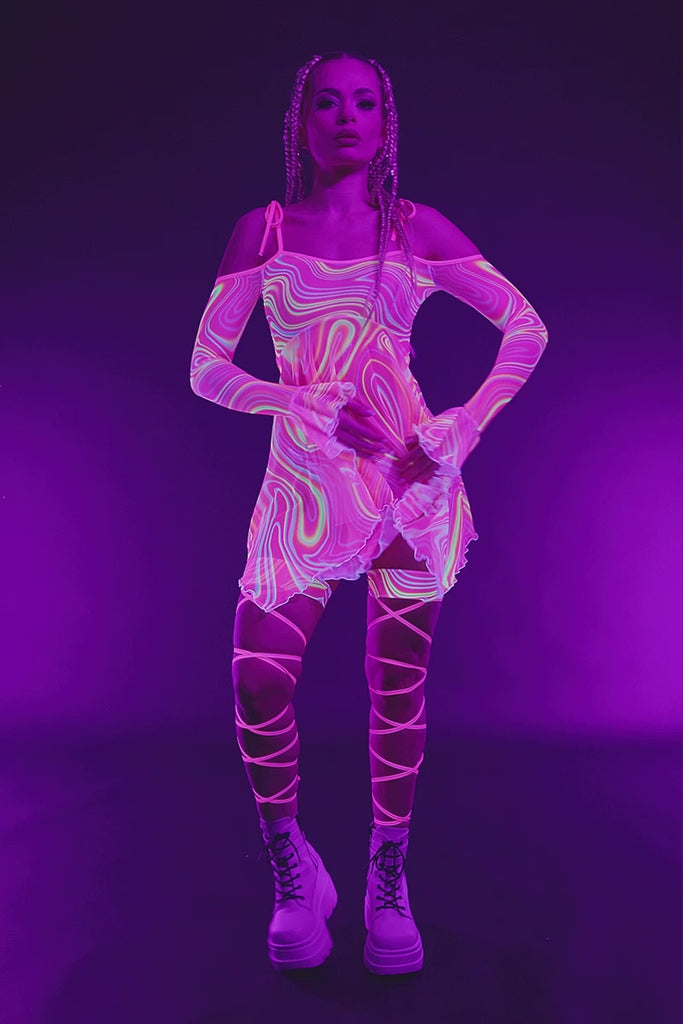 Glow like a candy-coated dream in this sundress with flounce sleeves, swirling in hypnotic waves of hot pink, orange, and white. The flared skirt and soft fabric flow with your every move, bringing major fairycore energy to your rave outfit. U didn’t come to play sweet—u came to play loud.