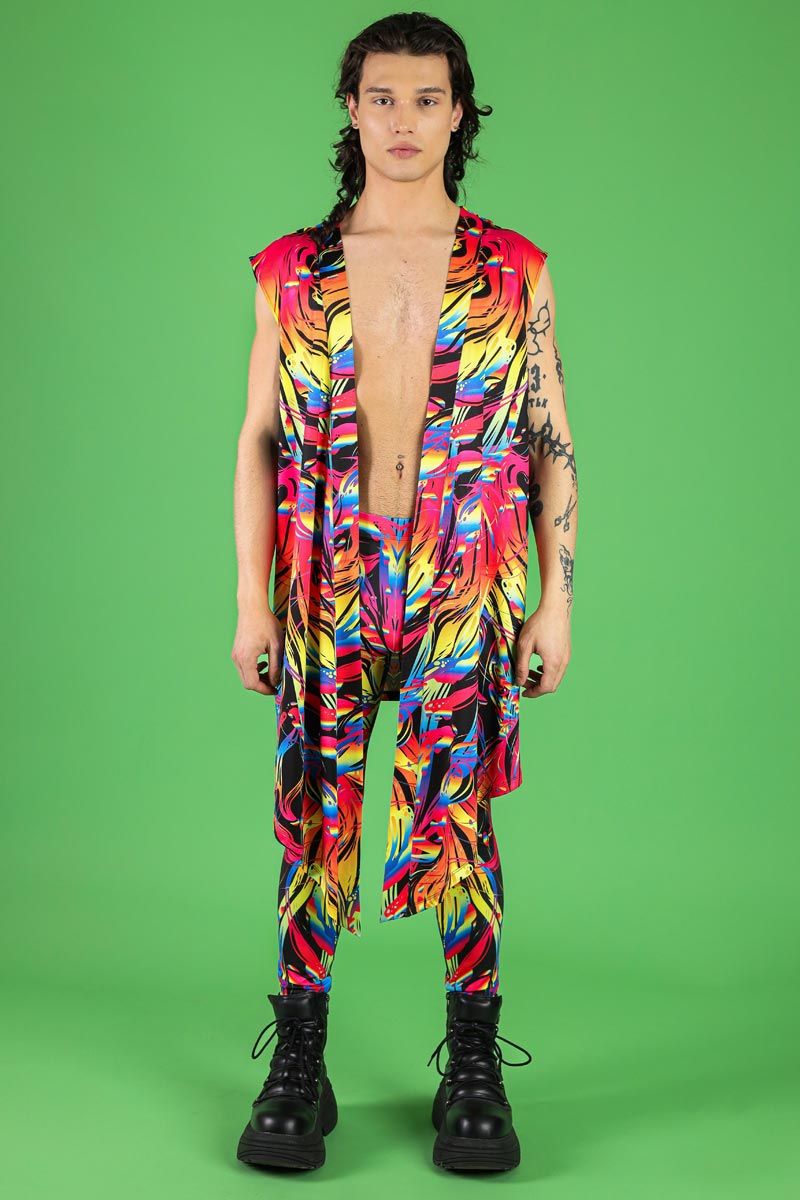 Make a statement with our men's kimono in the captivating Sunset Love design. This kimono features a relaxed, open-front style that drapes elegantly over any outfit. The vibrant pattern, inspired by the colors of a dramatic sunset, ensures you stand out at pride events, raves, and festivals. Lightweight and versatile, this kimono is perfect for layering and adding a bold touch to your festival wardrobe.