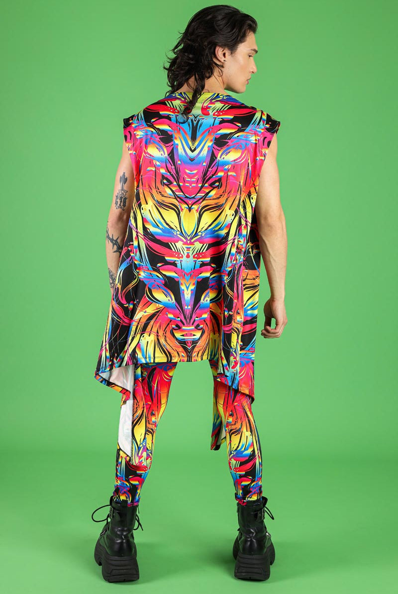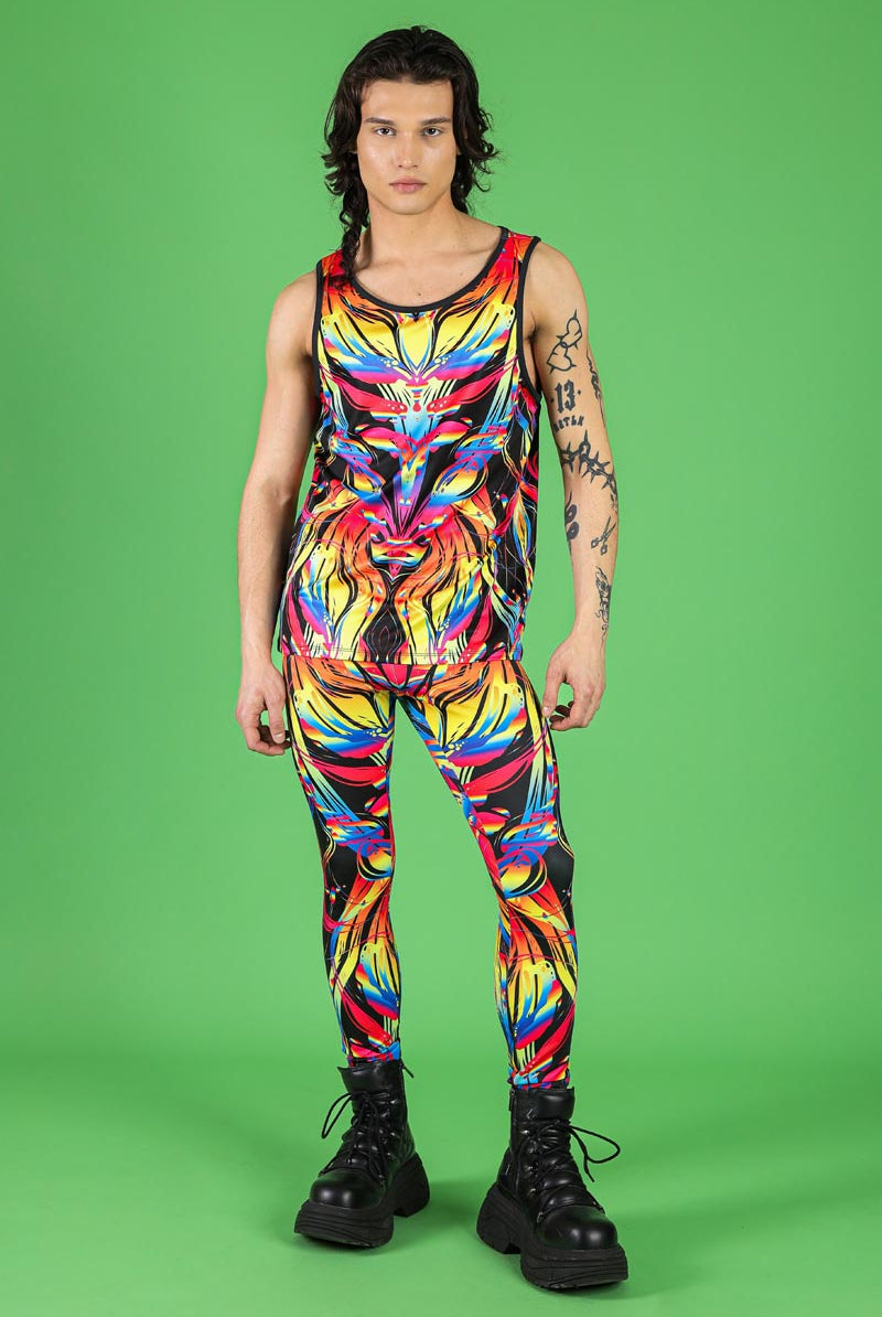 Make a statement with our Sunset Love set, perfect for pride, raves, and festivals. This set includes a men's tank top, leggings, and a striking kimono. The tank top features a crew neckline and sleeveless design, while the leggings provide a snug, flexible fit. The kimono adds an extra layer of style, flowing gracefully with its open front. Each piece showcases the vibrant Sunset Love pattern, combining to create a bold, cohesive look that's sure to turn heads at any event.